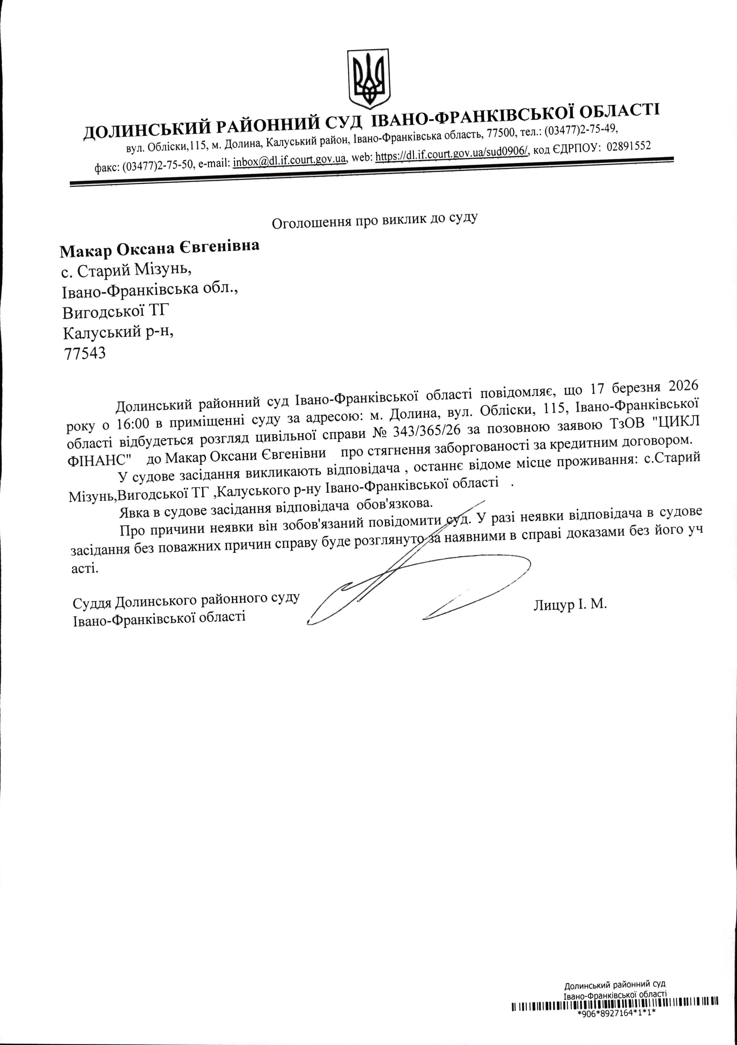 ОГОЛОШЕННЯ ПРО ВИКЛИК до СУДУ Макар Оксана Євгенівна у цивільній справі № 343/365/26