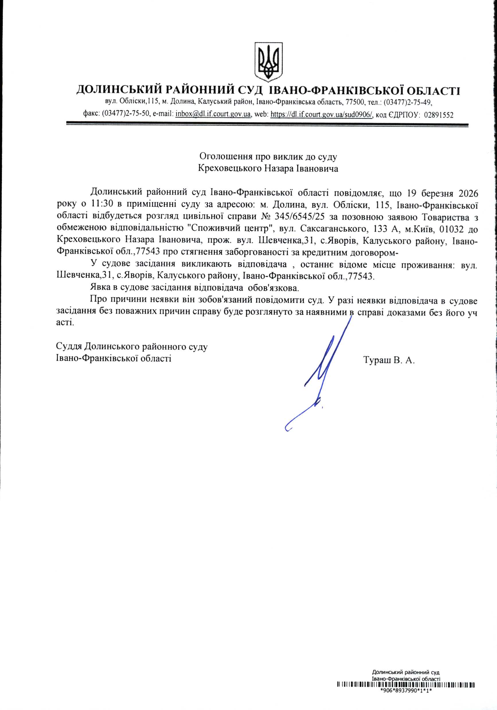 ОГОЛОШЕННЯ ПРО ВИКЛИК до СУДУ Креховецького Назара Івановича у цивільній справі № 345/6545/25