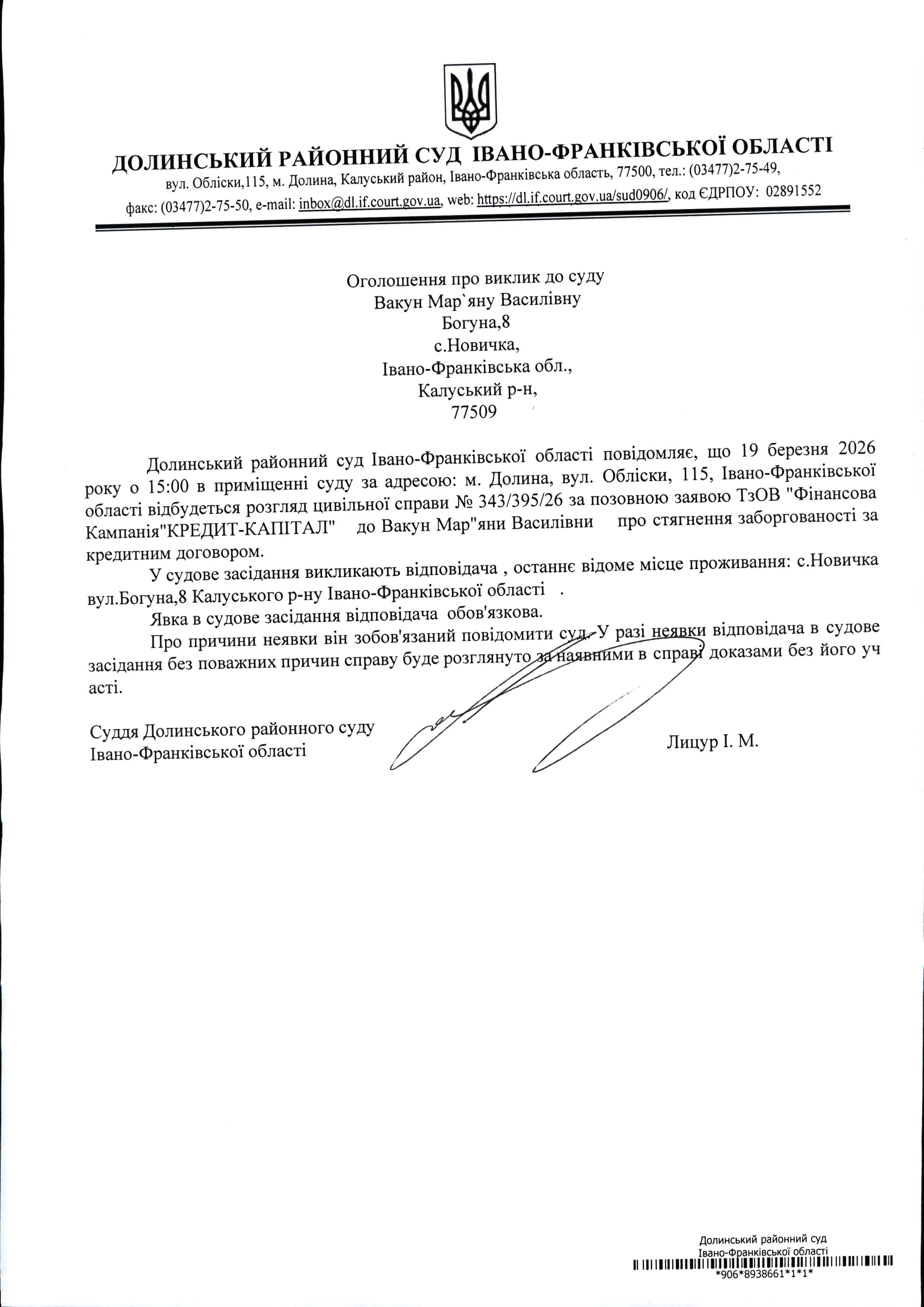 ОГОЛОШЕННЯ ПРО ВИКЛИК до СУДУ Вакун Мар'яну Василівну у цивільній справі № 343/395/26