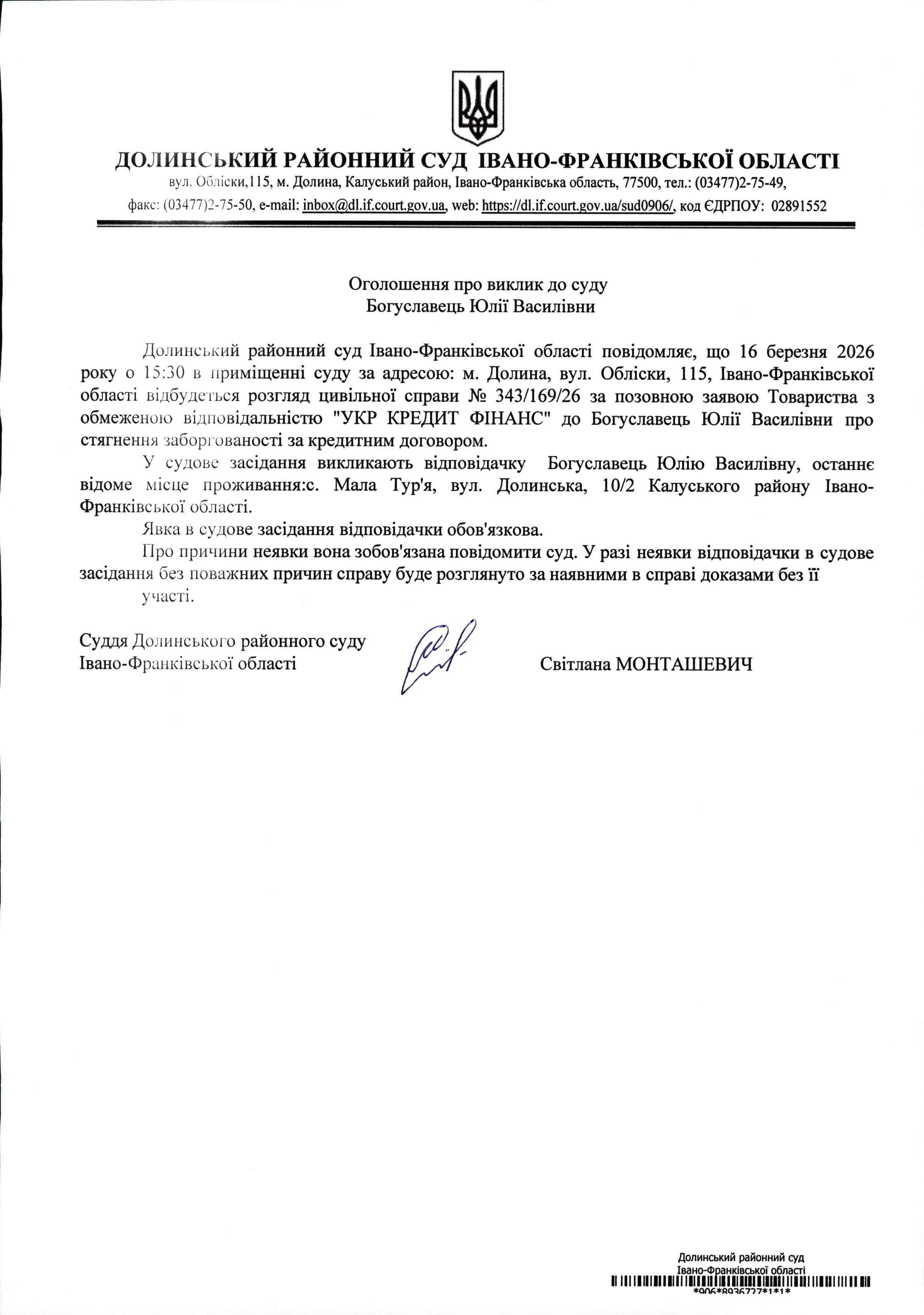 ОГОЛОШЕННЯ ПРО ВИКЛИК до СУДУ Богуславець Юлії Василівни у цивільній справі № 343/169/26