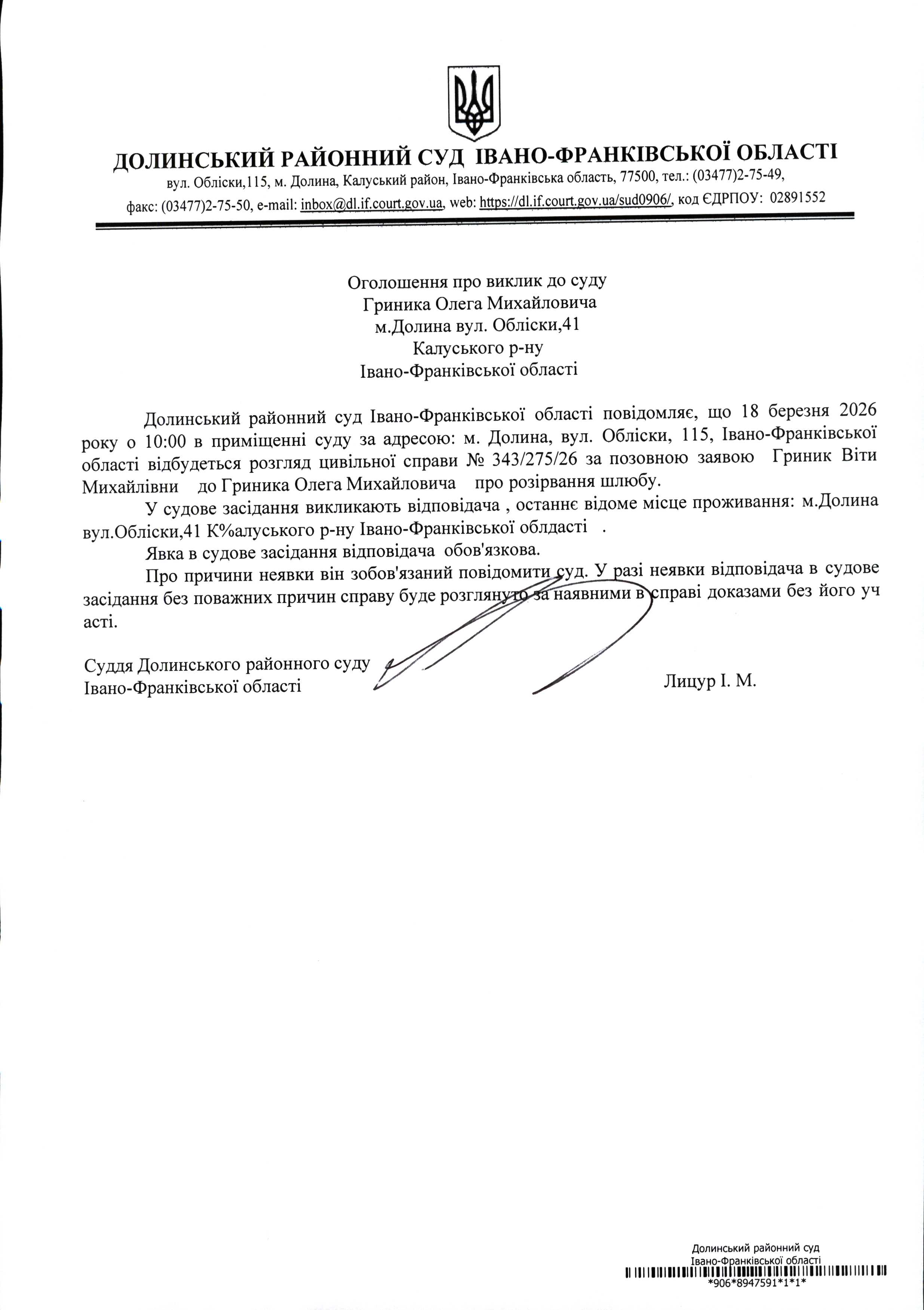 ОГОЛОШЕННЯ ПРО ВИКЛИК до СУДУ Гриника Олега Михайловича у цивільній справі № 343/275/26