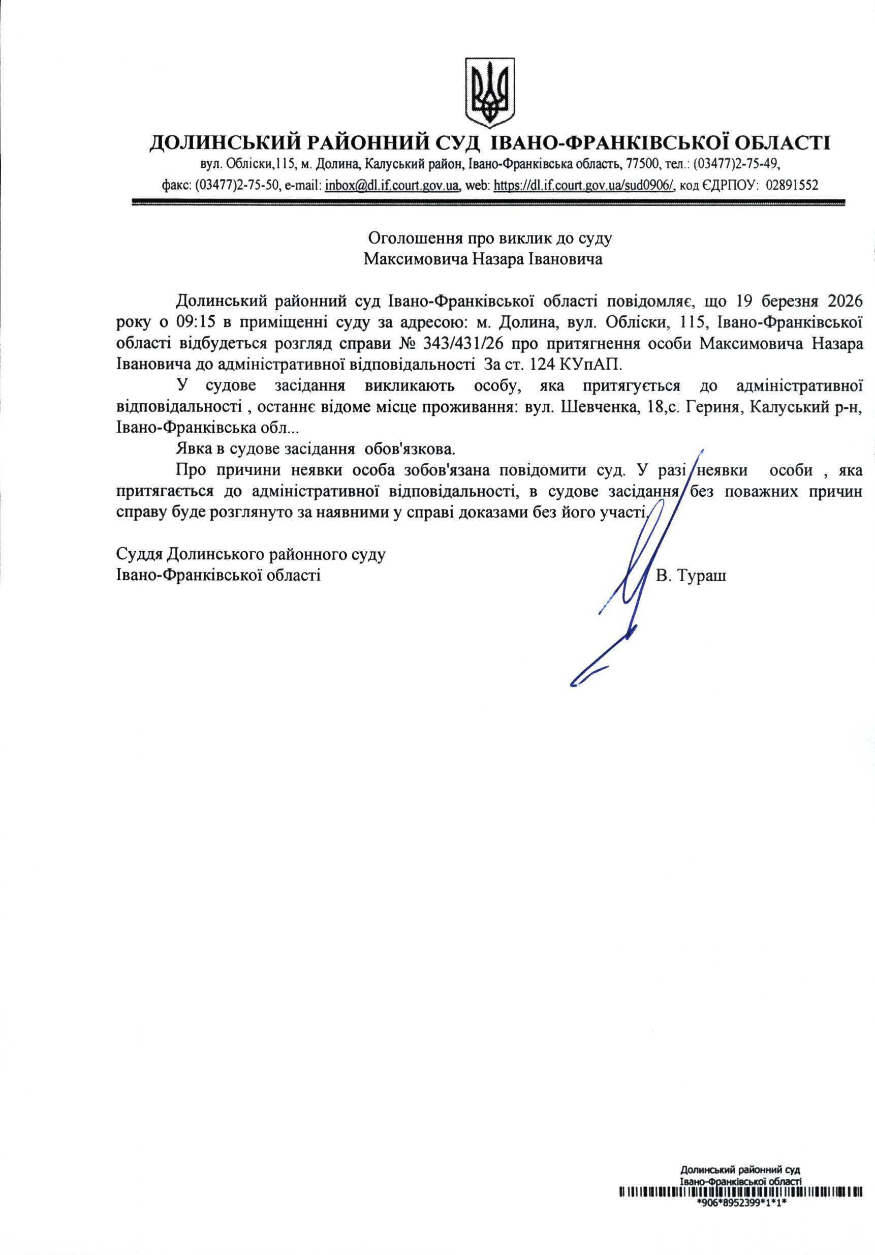 ОГОЛОШЕННЯ ПРО ВИКЛИК до СУДУ Максимовича Назара Івановича у цивільній справі № 343/431/26