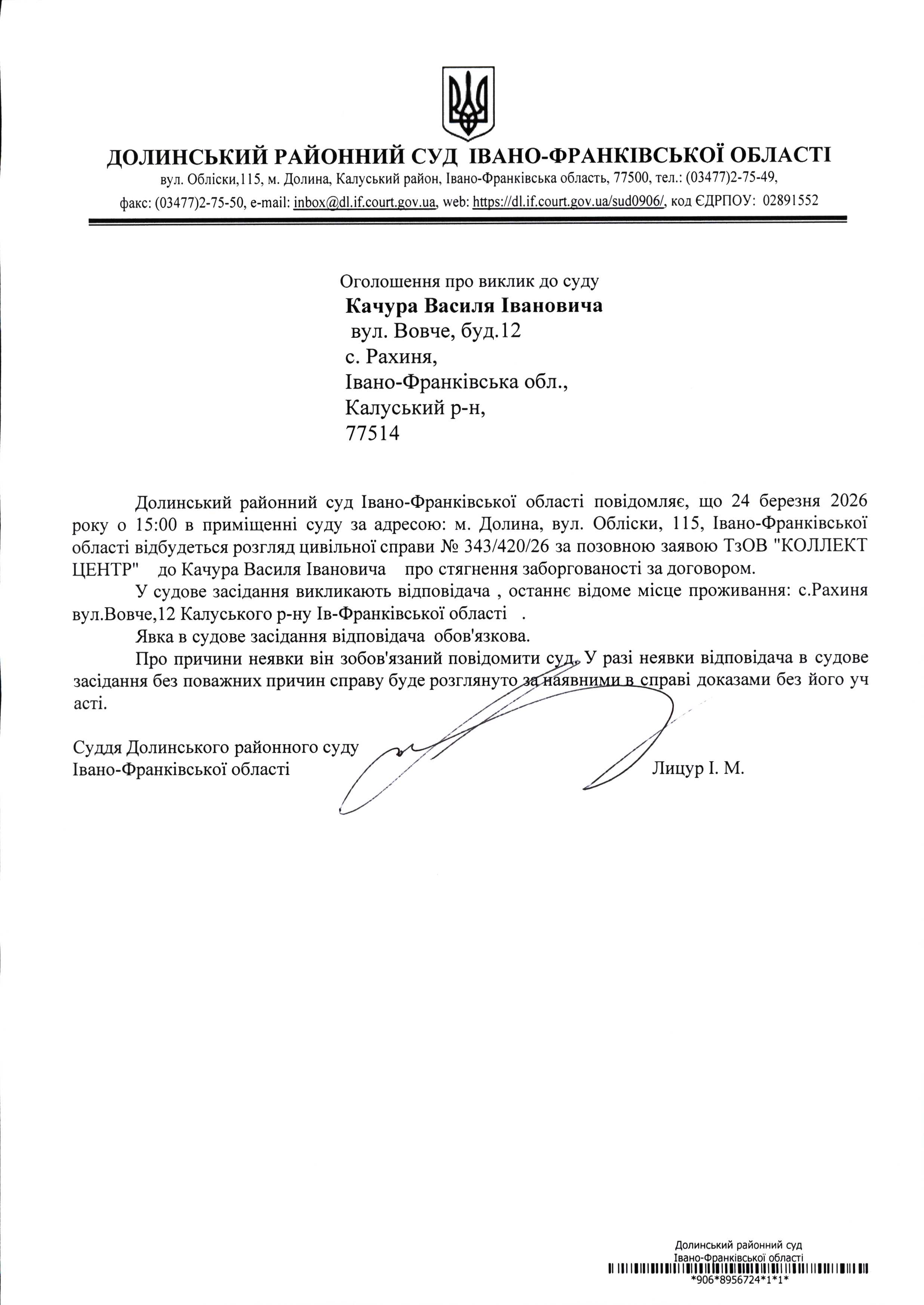 ОГОЛОШЕННЯ ПРО ВИКЛИК до СУДУ Качура Василя Івановича у цивільній справі № 343/420/26