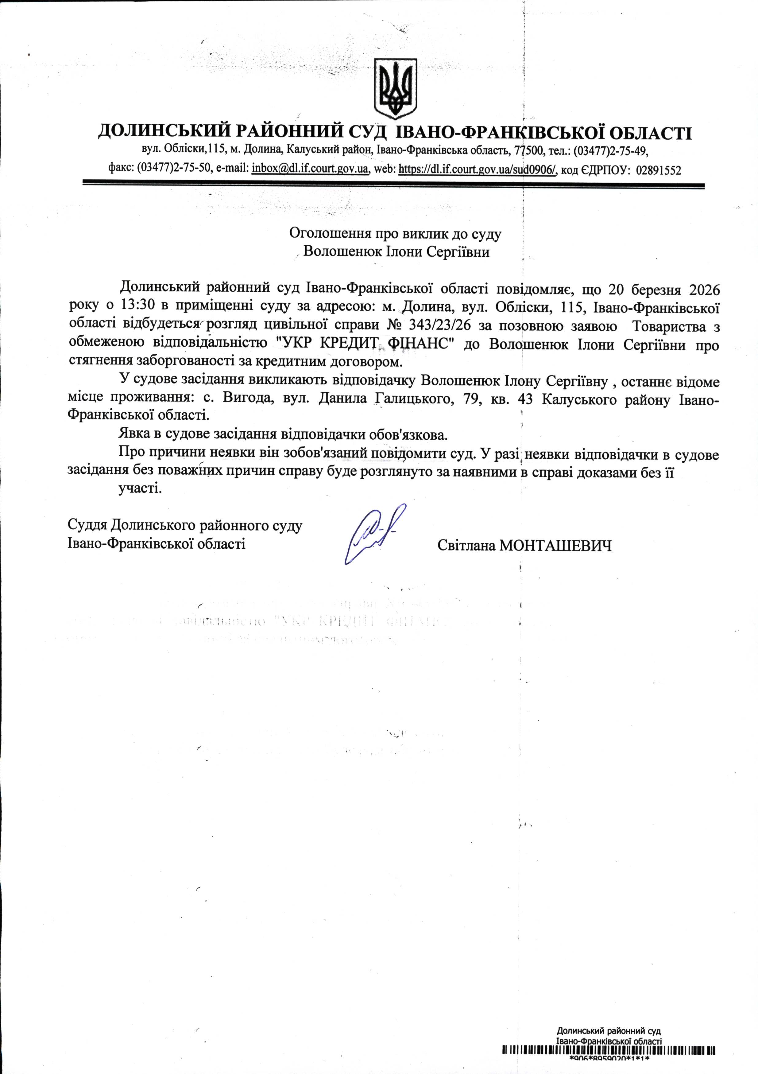 ОГОЛОШЕННЯ ПРО ВИКЛИК до СУДУ Волошенюк Ілони Сергіївни у цивільній справі № 343/23/26