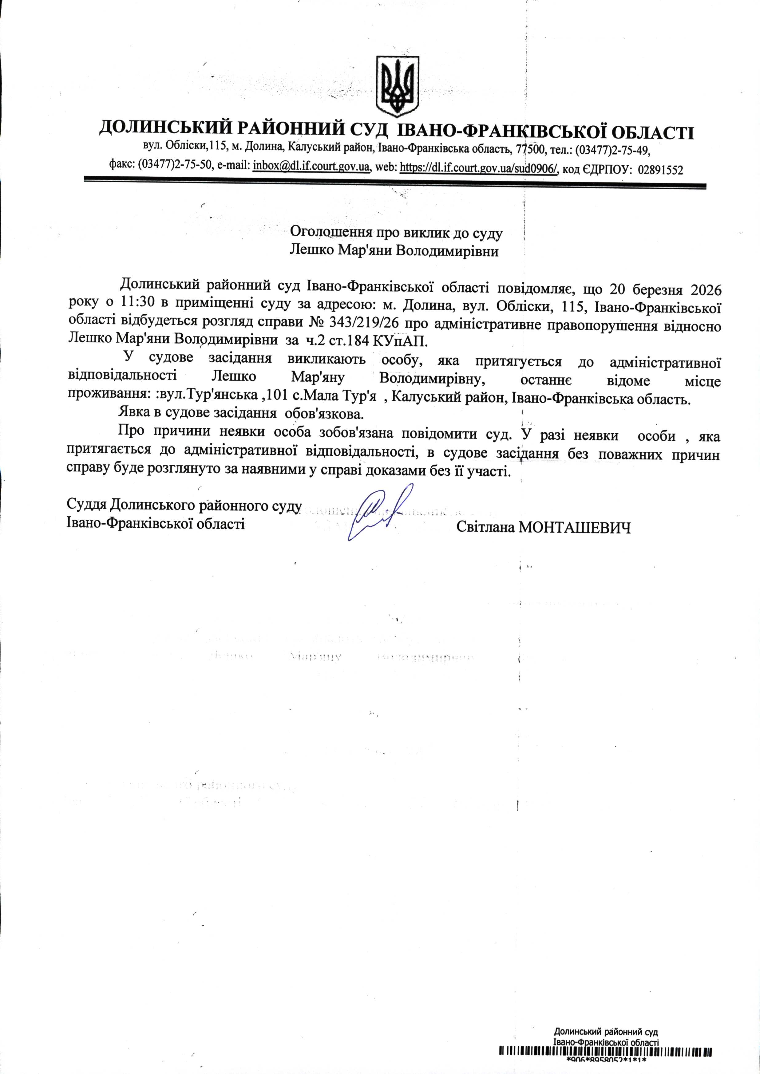 ОГОЛОШЕННЯ ПРО ВИКЛИК до СУДУ Лешко Мар'яни Володимирівни у цивільній справі № 343/219/26
