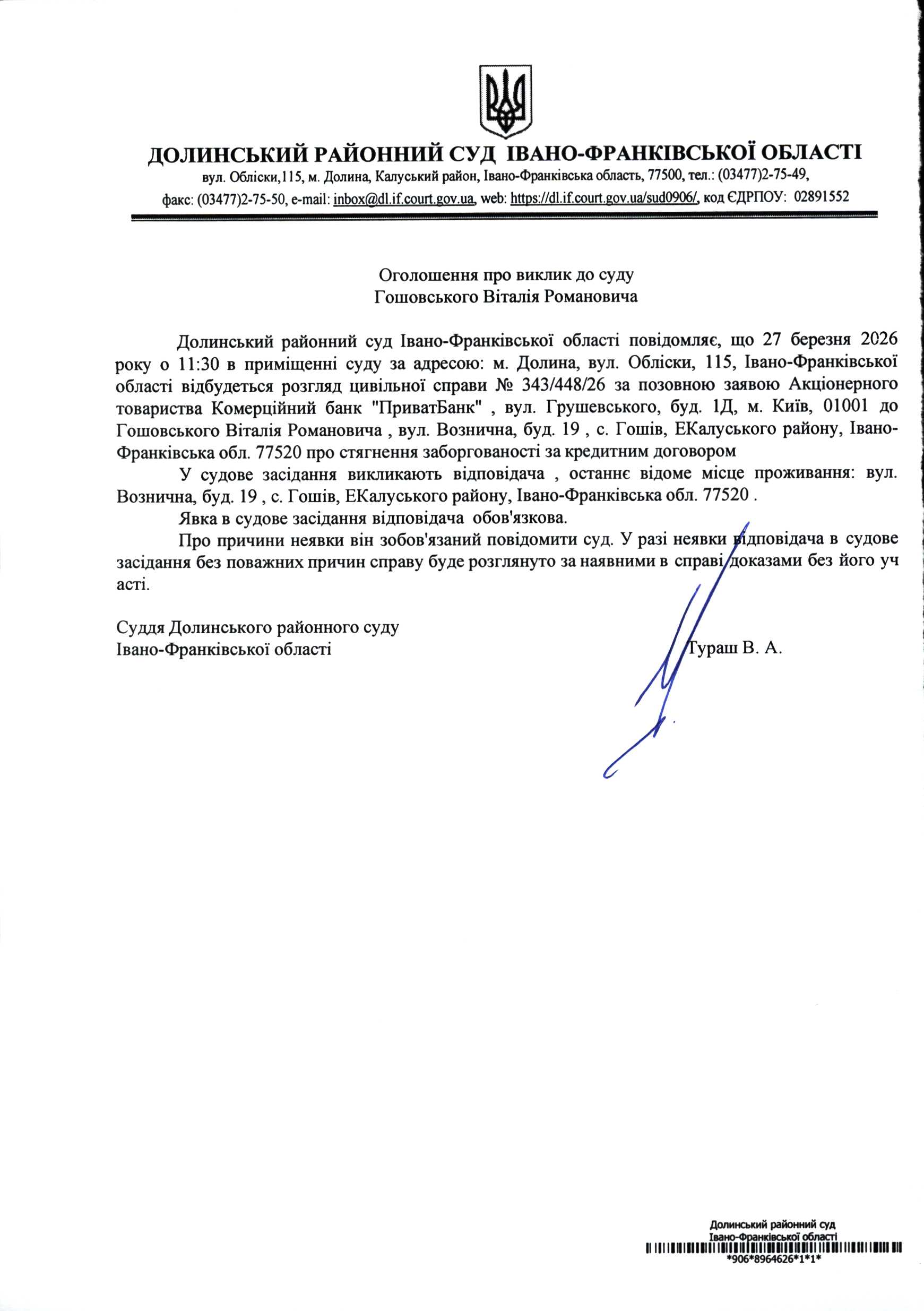 ОГОЛОШЕННЯ ПРО ВИКЛИК до СУДУ Гошовського Віталія Романовича у цивільній справі № 343/448/26