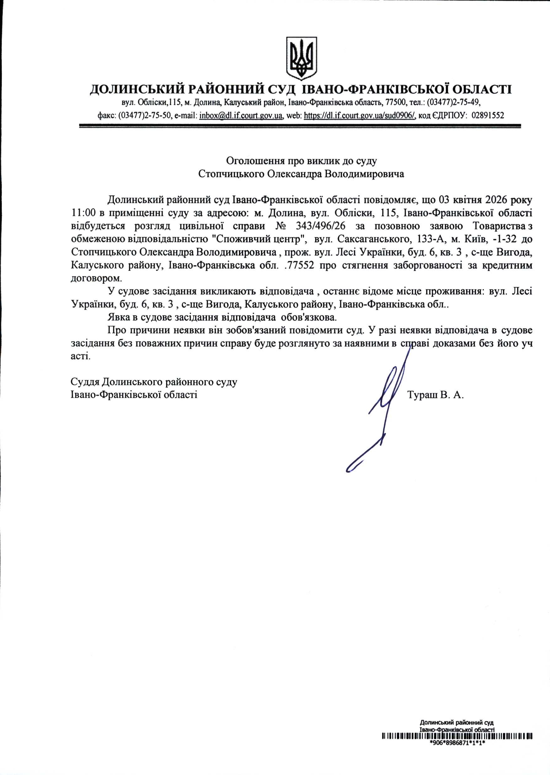ОГОЛОШЕННЯ ПРО ВИКЛИК до СУДУ Стопчицького Олександра Володимировича у цивільній справі № 343/496/26