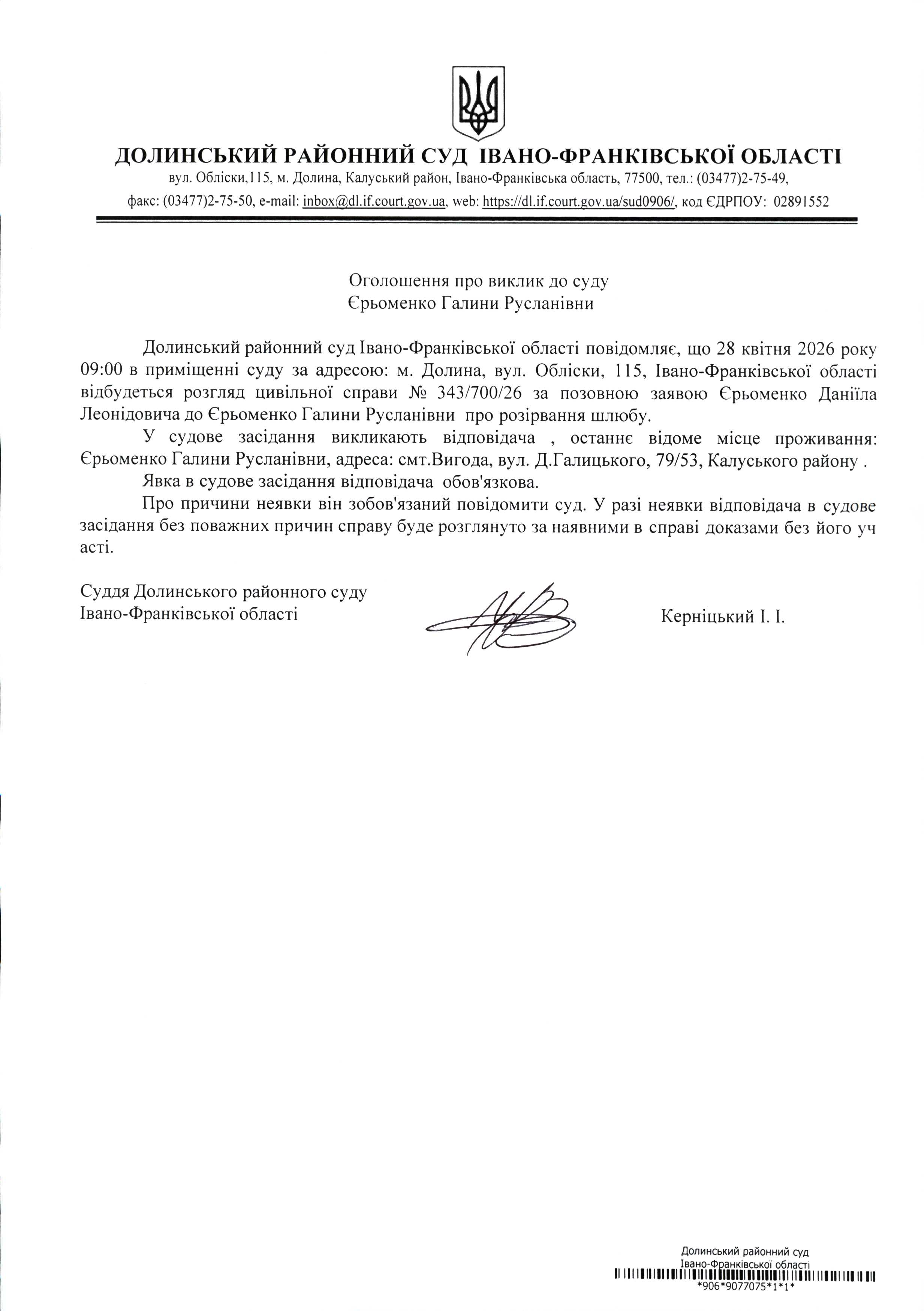 ОГОЛОШЕННЯ ПРО ВИКЛИК до СУДУ Єрьоменко Галини Русланівни у цивільній справі № 343/700/26