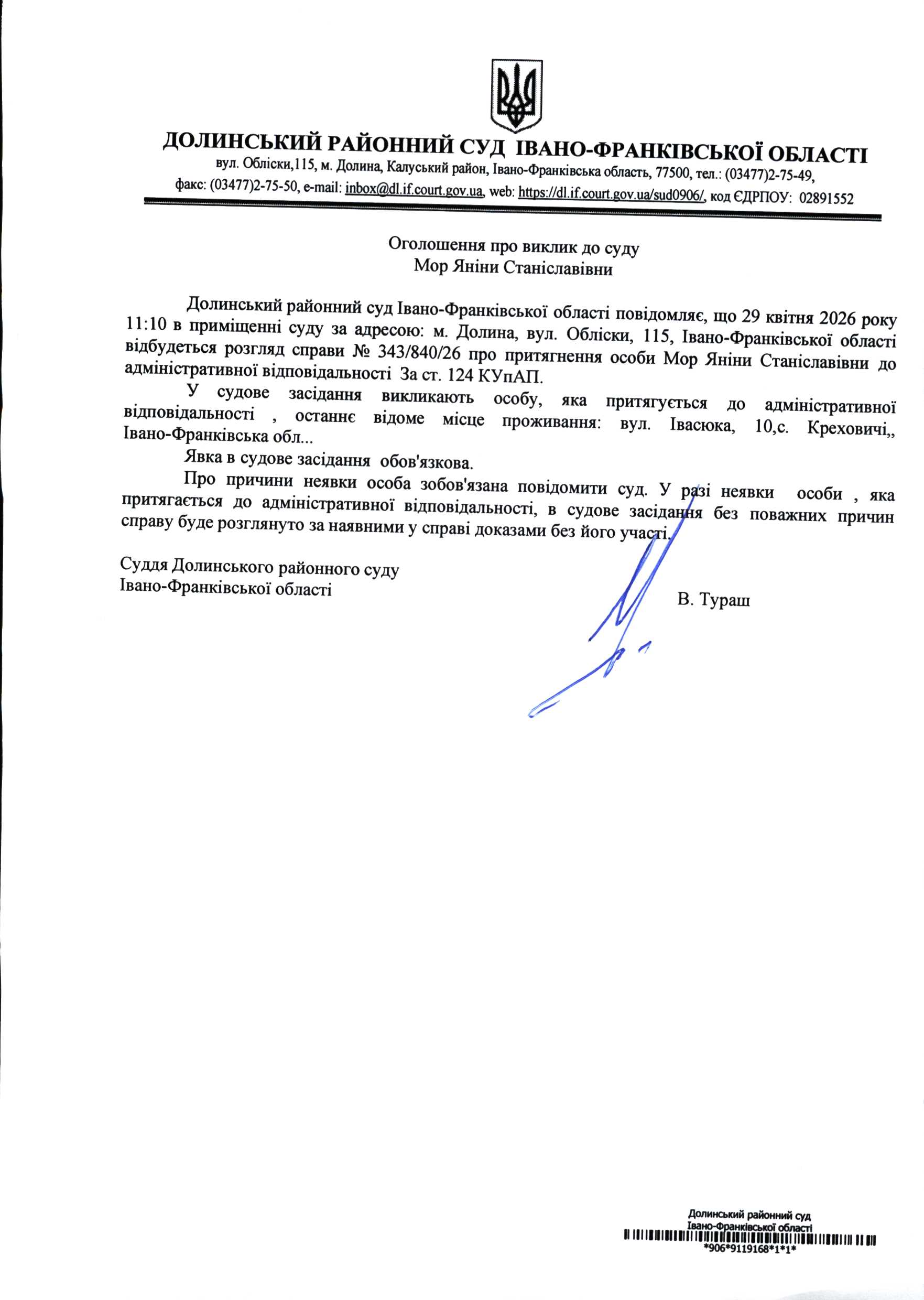 ОГОЛОШЕННЯ ПРО ВИКЛИК до СУДУ Мор Яніни Станіславівни в адміністративній справі № 343/840/26