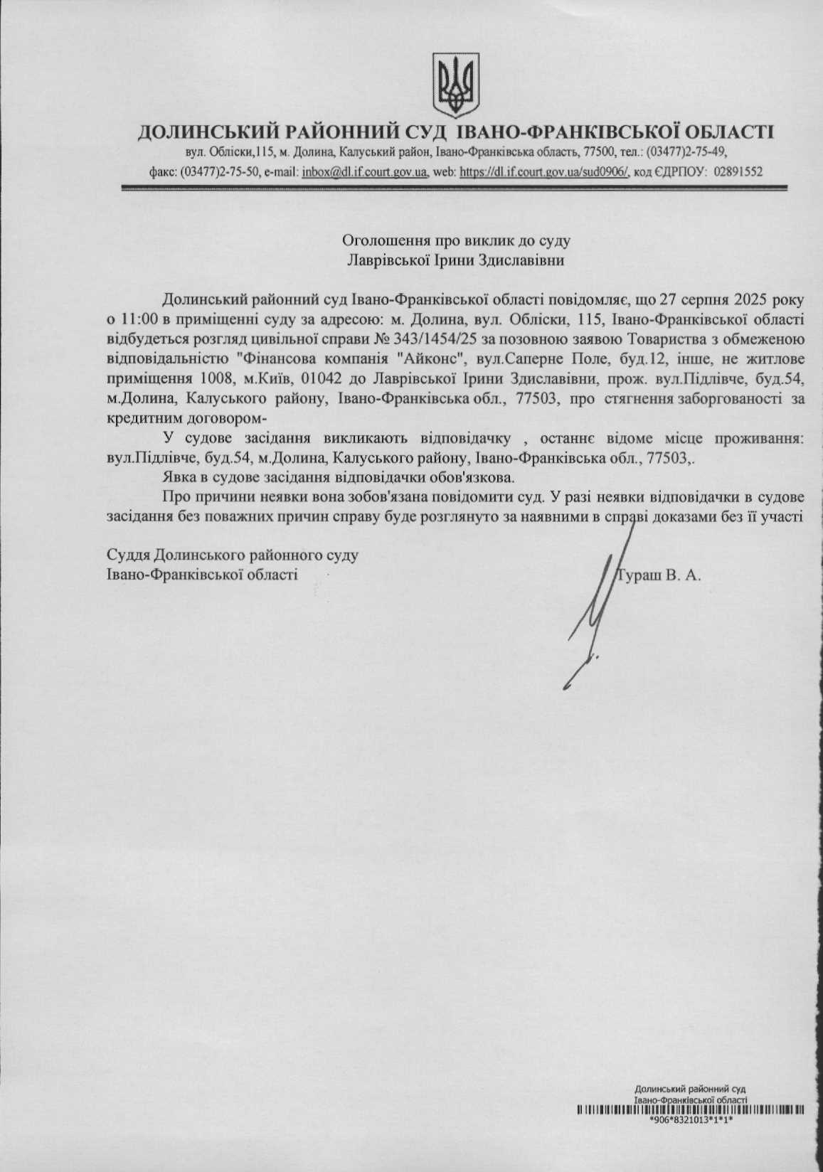 ОГОЛОШЕННЯ ПРО ВИКЛИК до СУДУ Лаврівської Ірини Здиславівни у цивільній справі № 343/1454/25