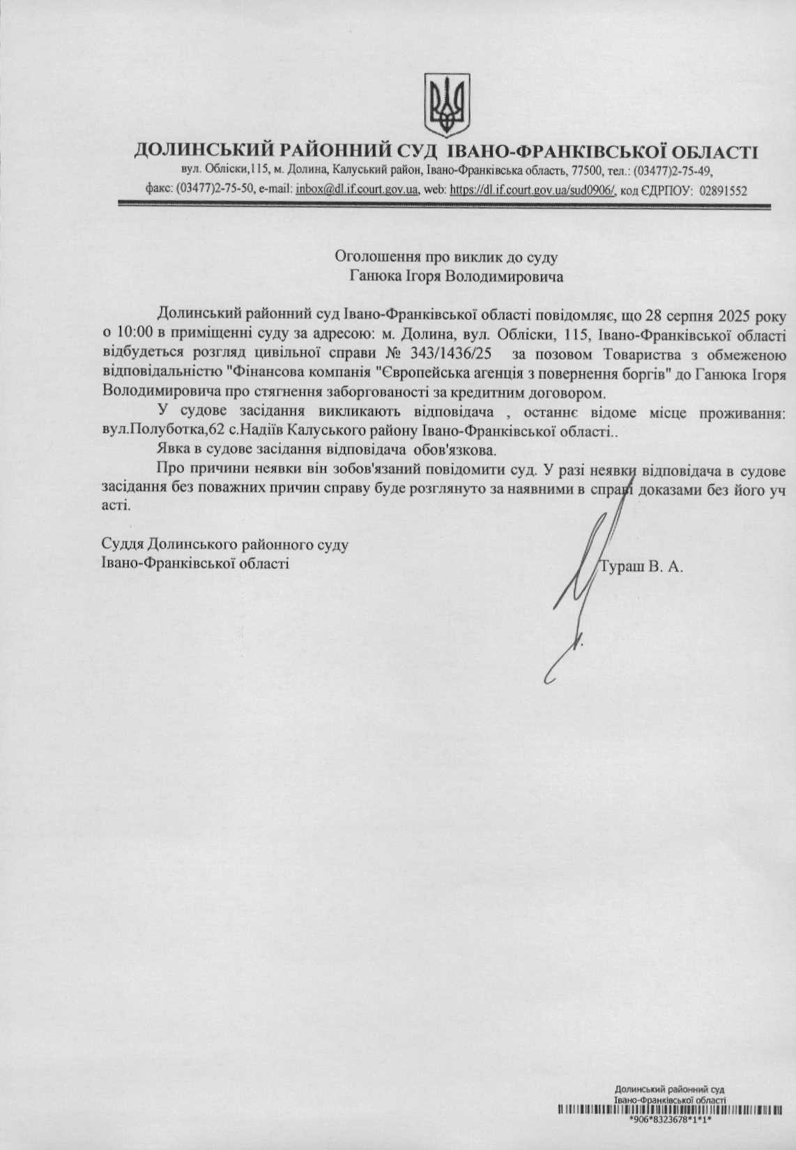 ОГОЛОШЕННЯ ПРО ВИКЛИК до СУДУ Ганюка Ігоря Володимировича у цивільній справі № 343/1436/25