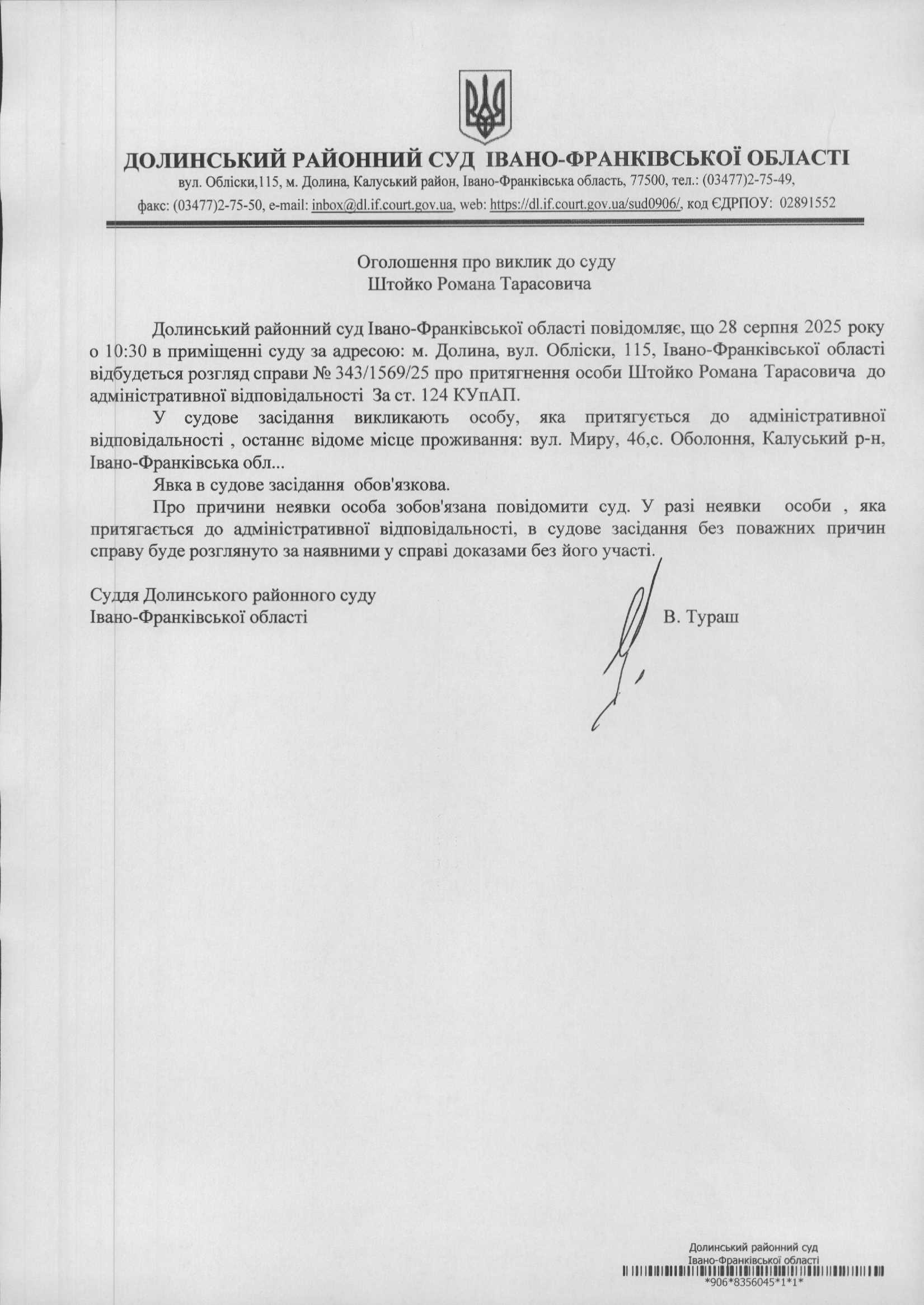 ОГОЛОШЕННЯ ПРО ВИКЛИК до СУДУ Штойка Романа Тарасовича в адміністративній справі № 343/1569/25
