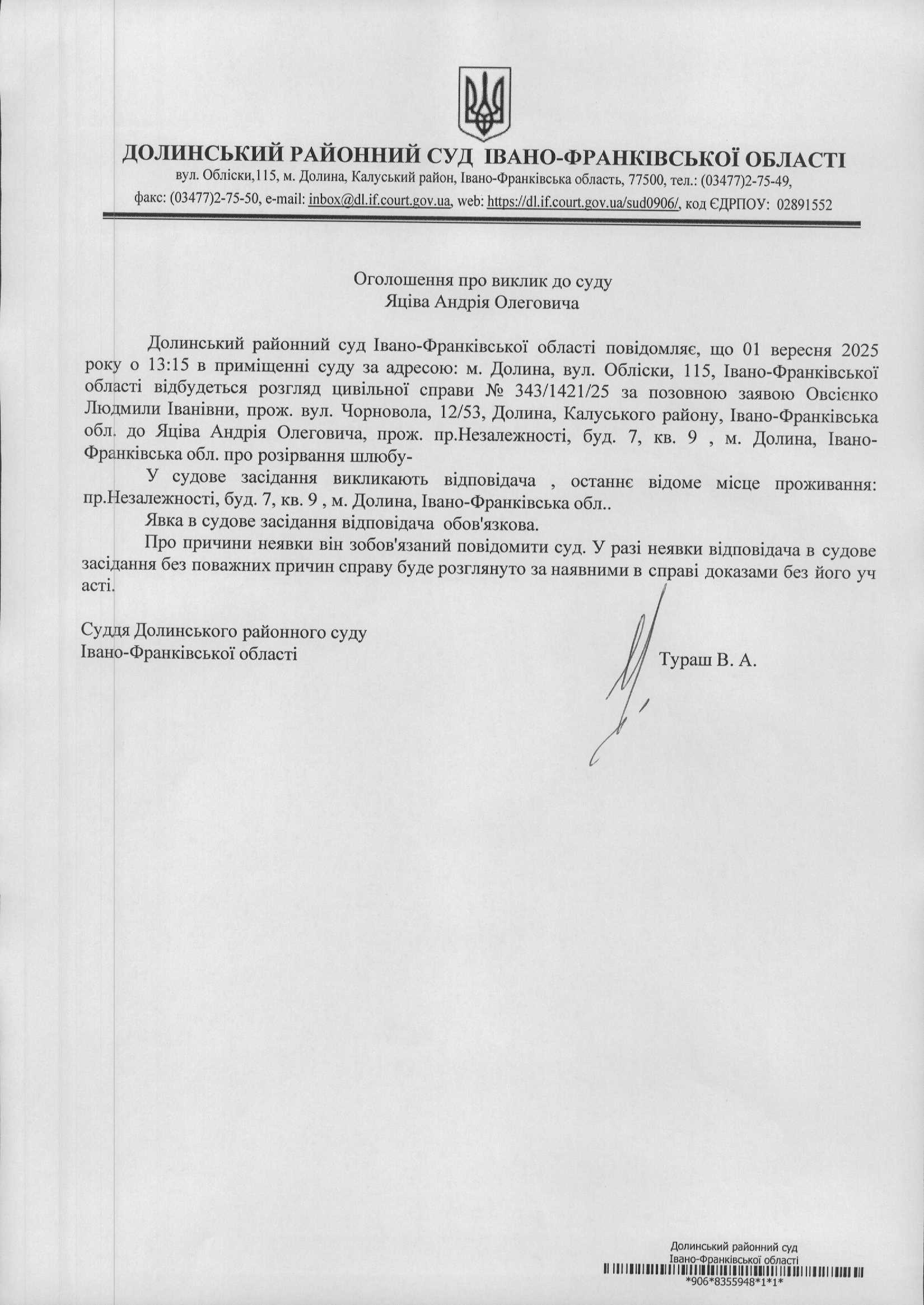 ОГОЛОШЕННЯ ПРО ВИКЛИК до СУДУ Яціва Андрія Олеговича у цивільній справі № 343/1421/25