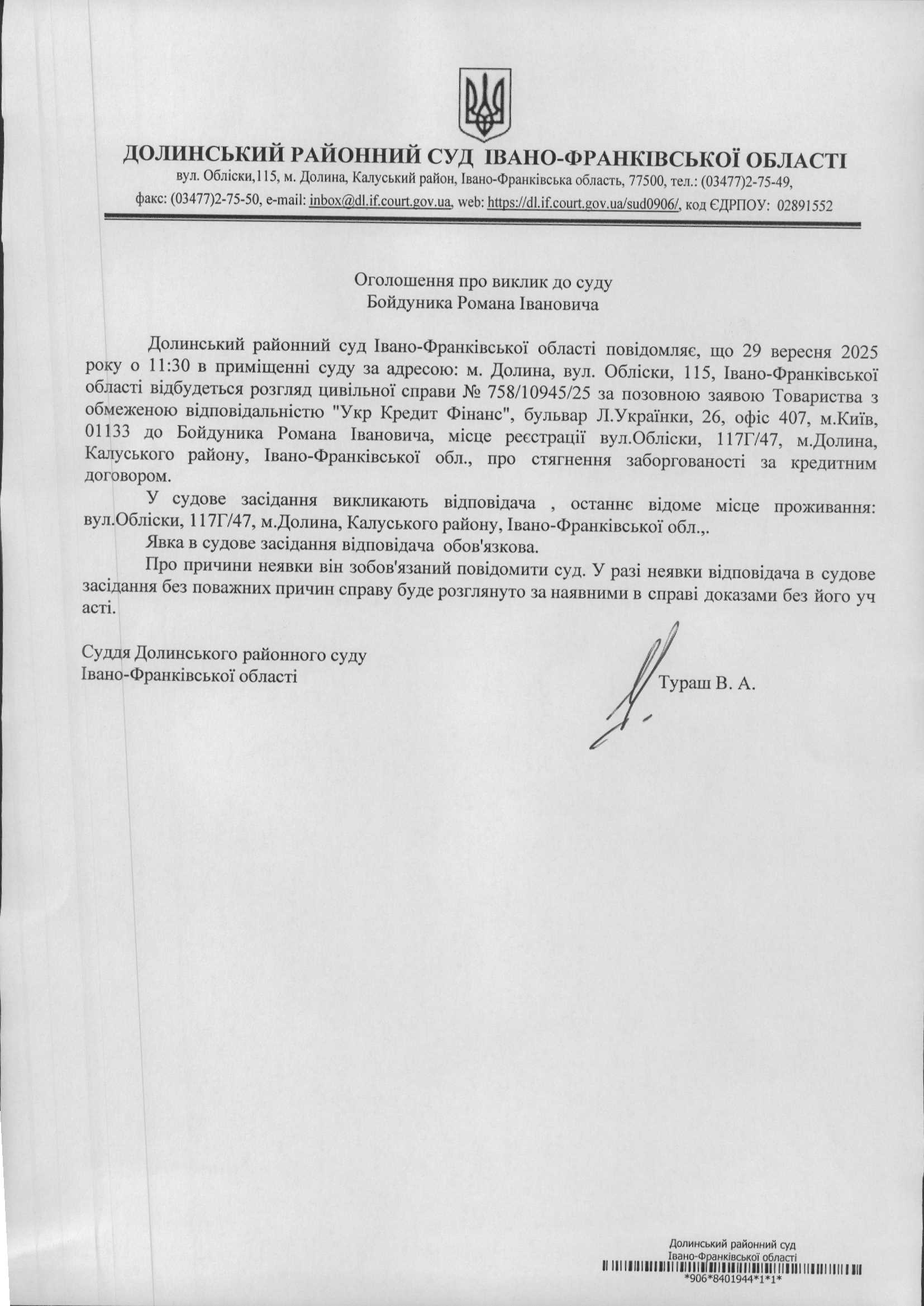 ОГОЛОШЕННЯ ПРО ВИКЛИК до СУДУ Бойдуника Романа Івановича у цивільній справі № 758/10945/25