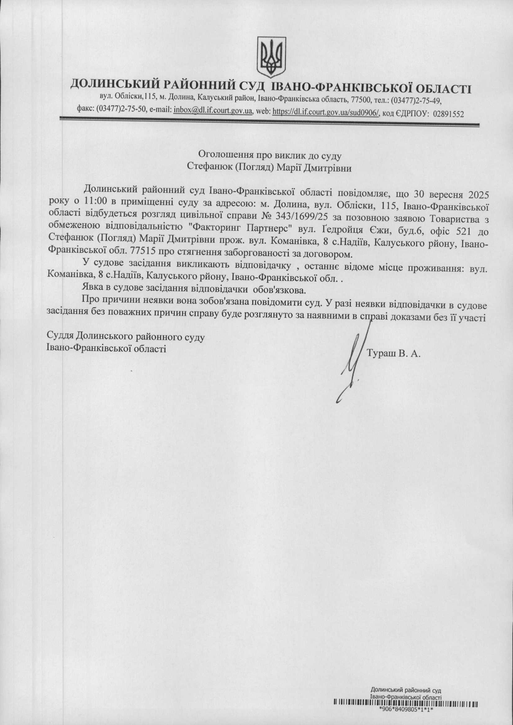 ОГОЛОШЕННЯ ПРО ВИКЛИК до СУДУ Стефанюк (Погляд) Марії Дмитрівни у цивільній справі № 343/1699/25