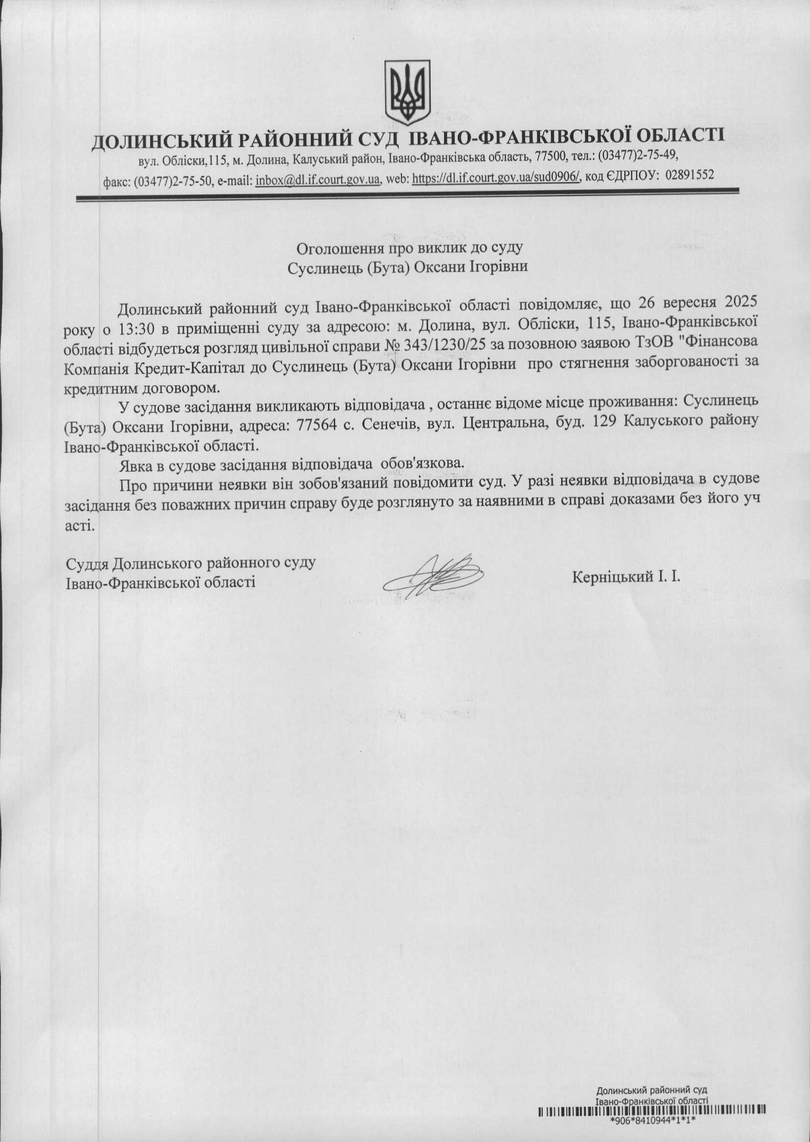 ОГОЛОШЕННЯ ПРО ВИКЛИК до СУДУ Суслинець (Бута) Оксани Ігорівни у цивільній справі № 343/1230/25