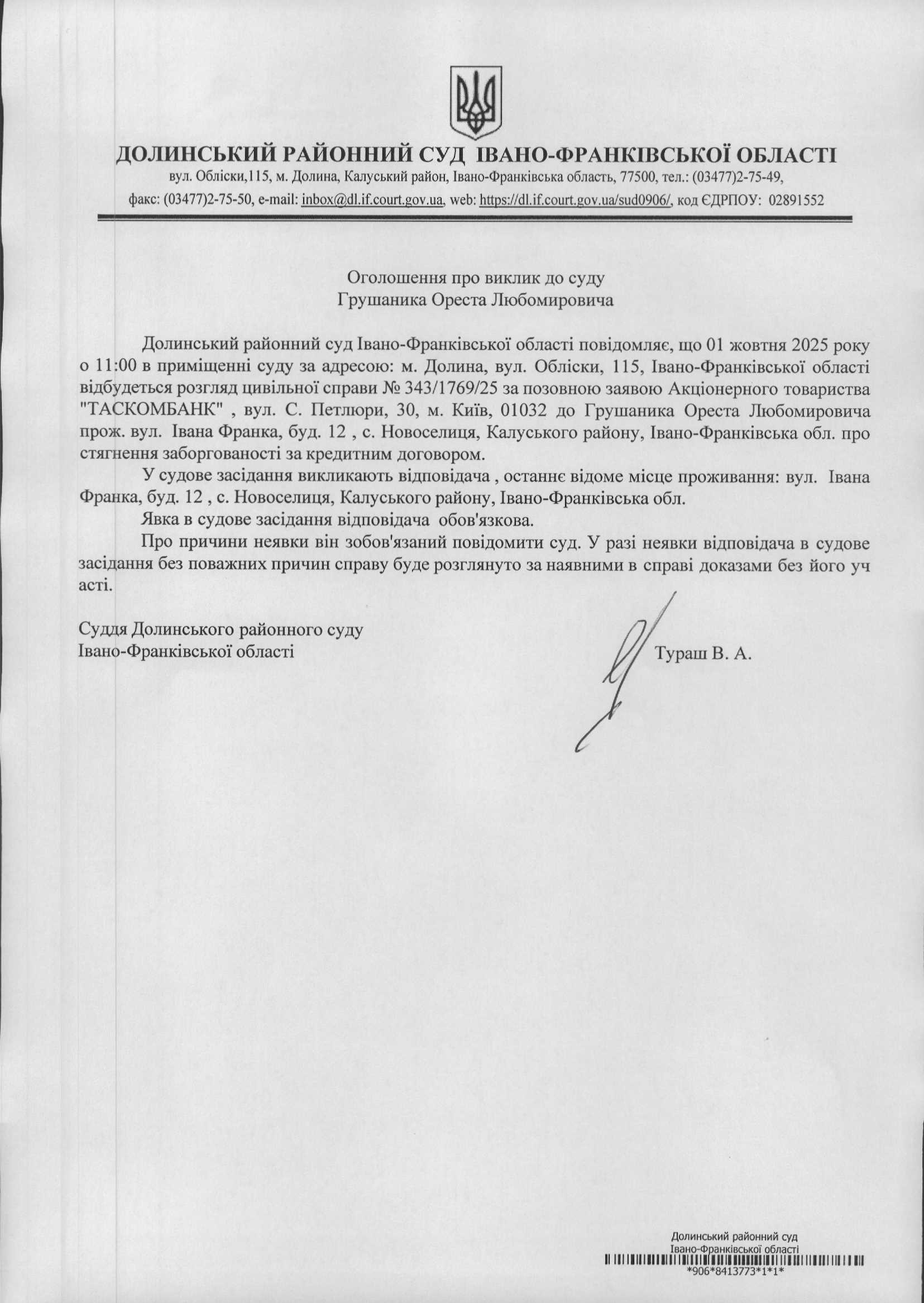 ОГОЛОШЕННЯ ПРО ВИКЛИК до СУДУ Грушаника Ореста Любомировича у цивільній справі № 343/1769/25