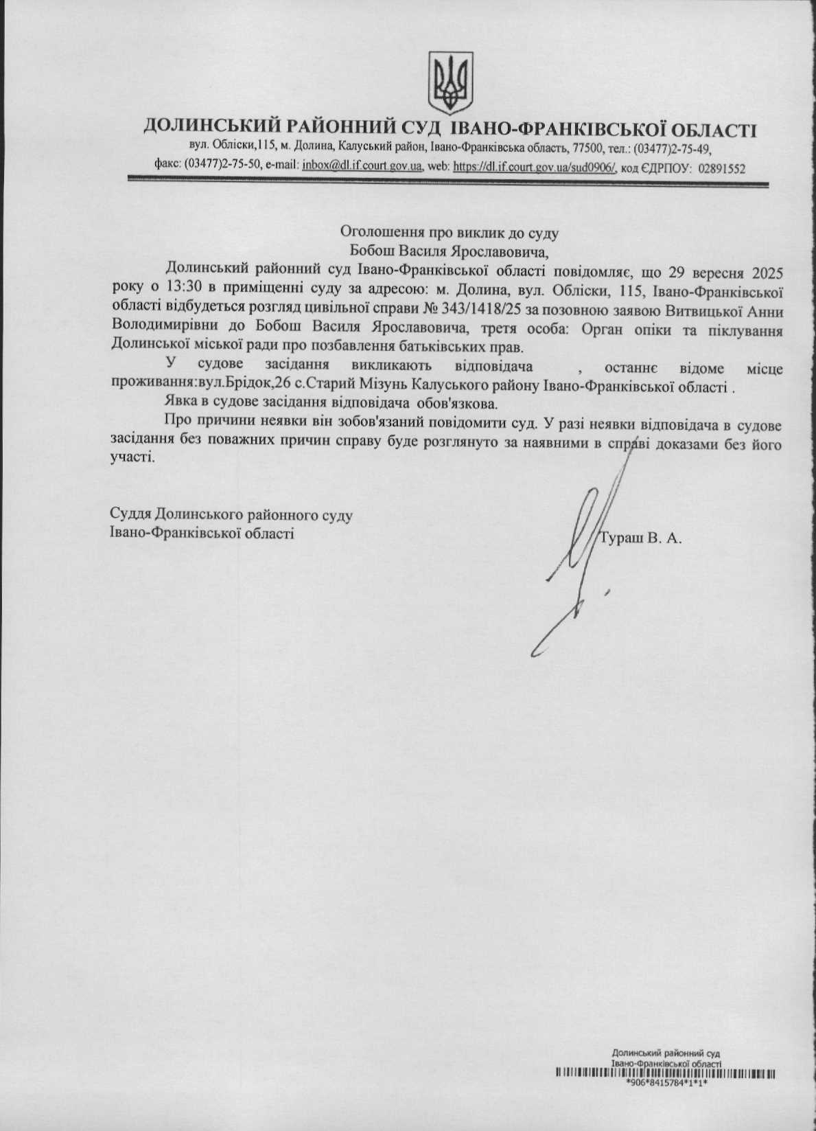 ОГОЛОШЕННЯ ПРО ВИКЛИК до СУДУ Бобош Василя Ярославовича у цивільній справі № 343/1418/25