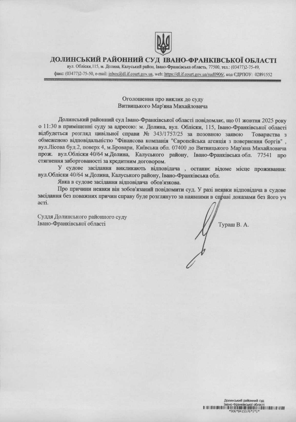 ОГОЛОШЕННЯ ПРО ВИКЛИК до СУДУ Витвицького Мар'яна Михайловича у цивільній справі № 343/1757/25