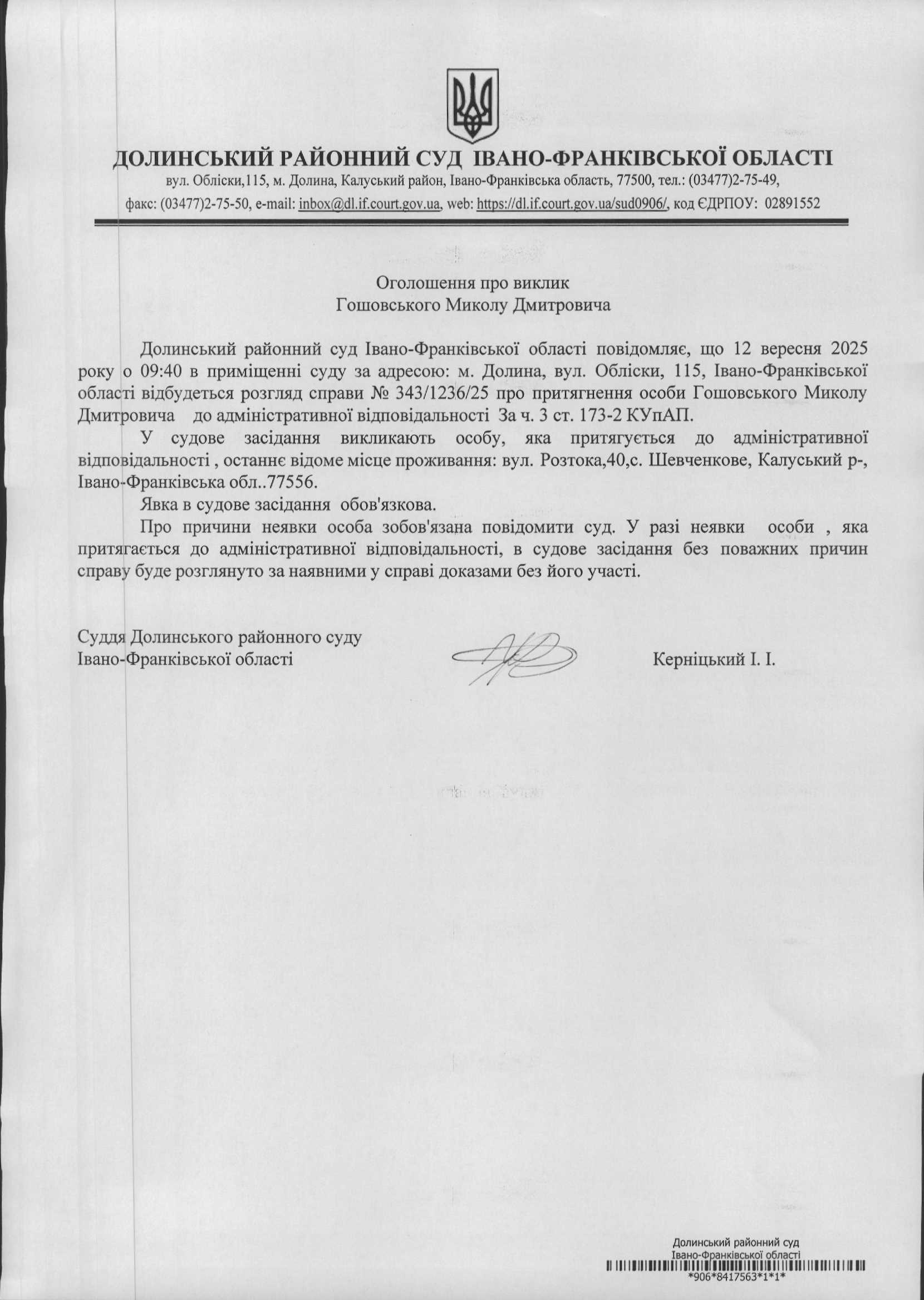 ОГОЛОШЕННЯ ПРО ВИКЛИК до СУДУ Гошовського Миколу Дмитровича у справі про адміністративне правопорушення № 343/1236/25