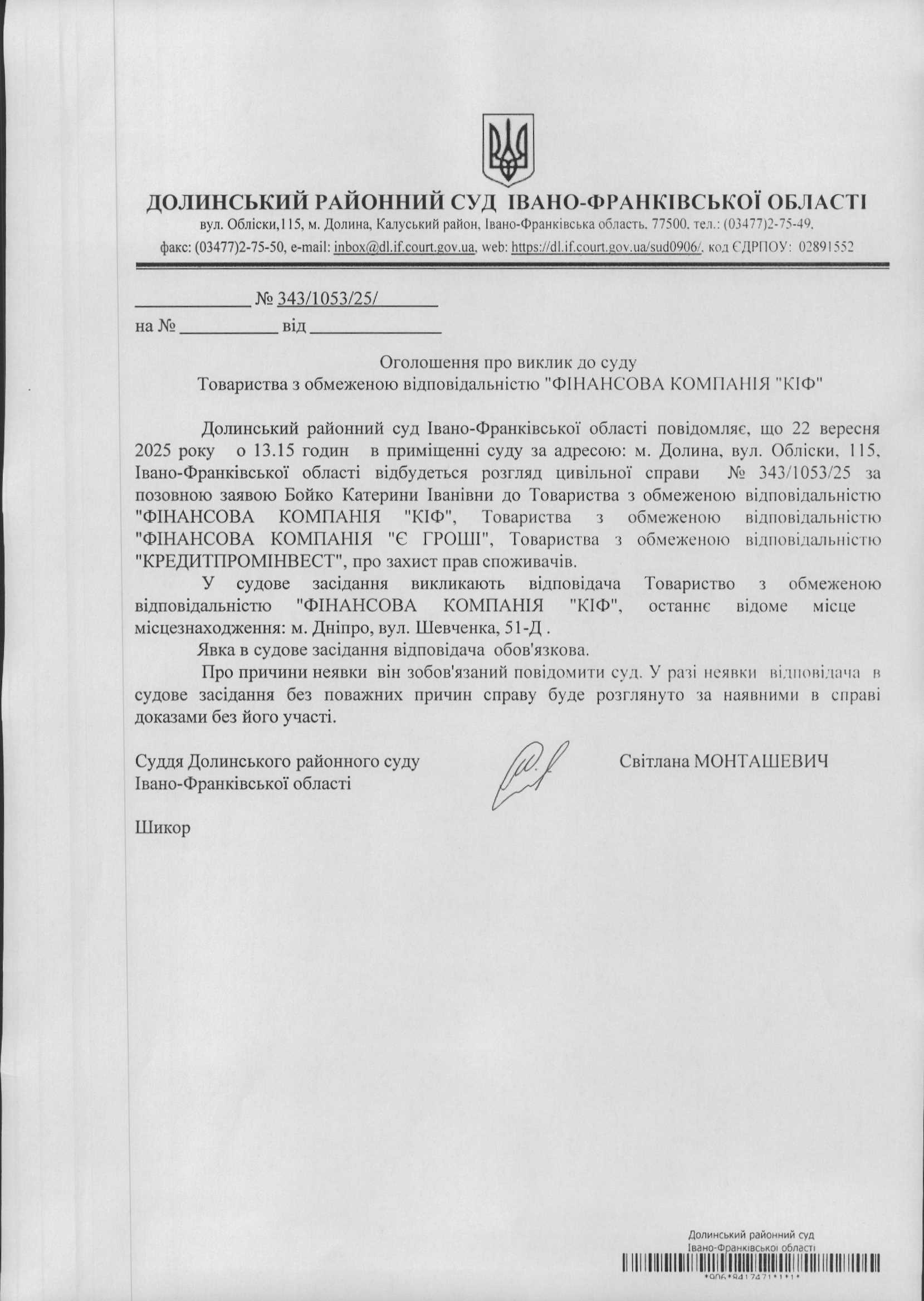 ОГОЛОШЕННЯ ПРО ВИКЛИК до СУДУ Товариства з обмеженою відповідальністю ФІНАНСОВА КОМПАНІЯ КІФ у цивільній справі № 343/1053/25