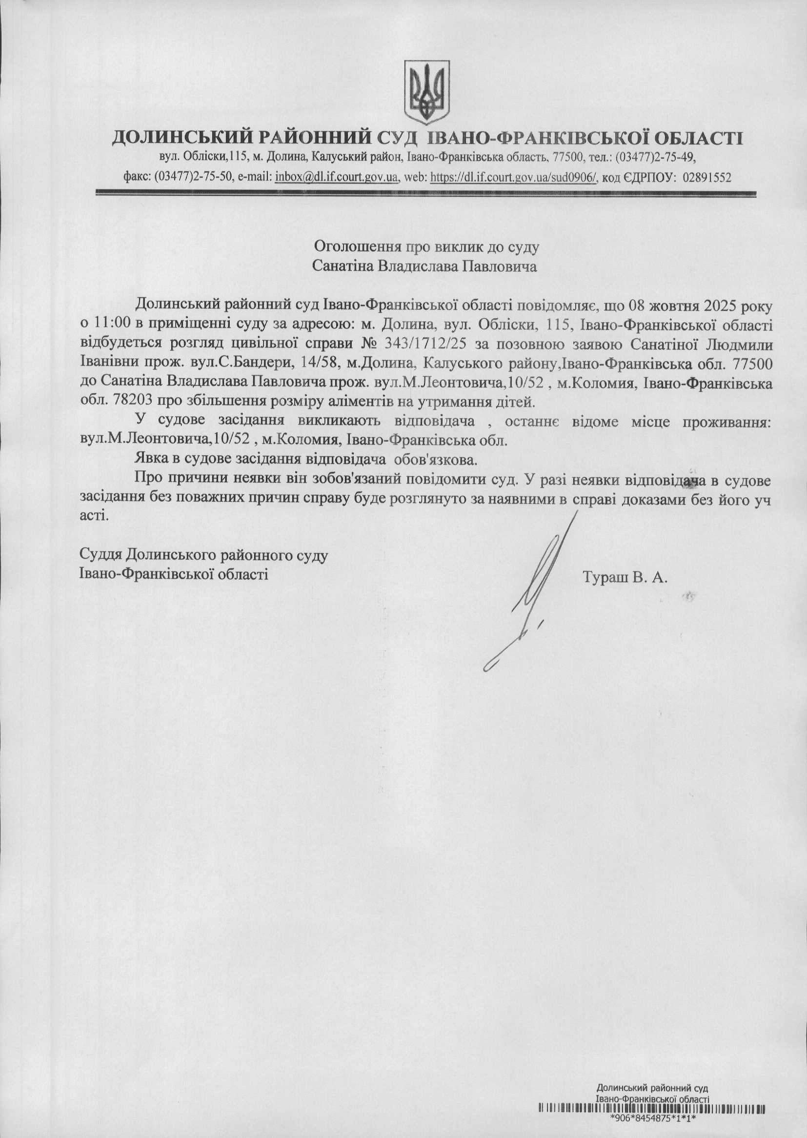 ОГОЛОШЕННЯ ПРО ВИКЛИК до СУДУ Санатіна Владислава Павловича у цивільній справі № 343/1712/25