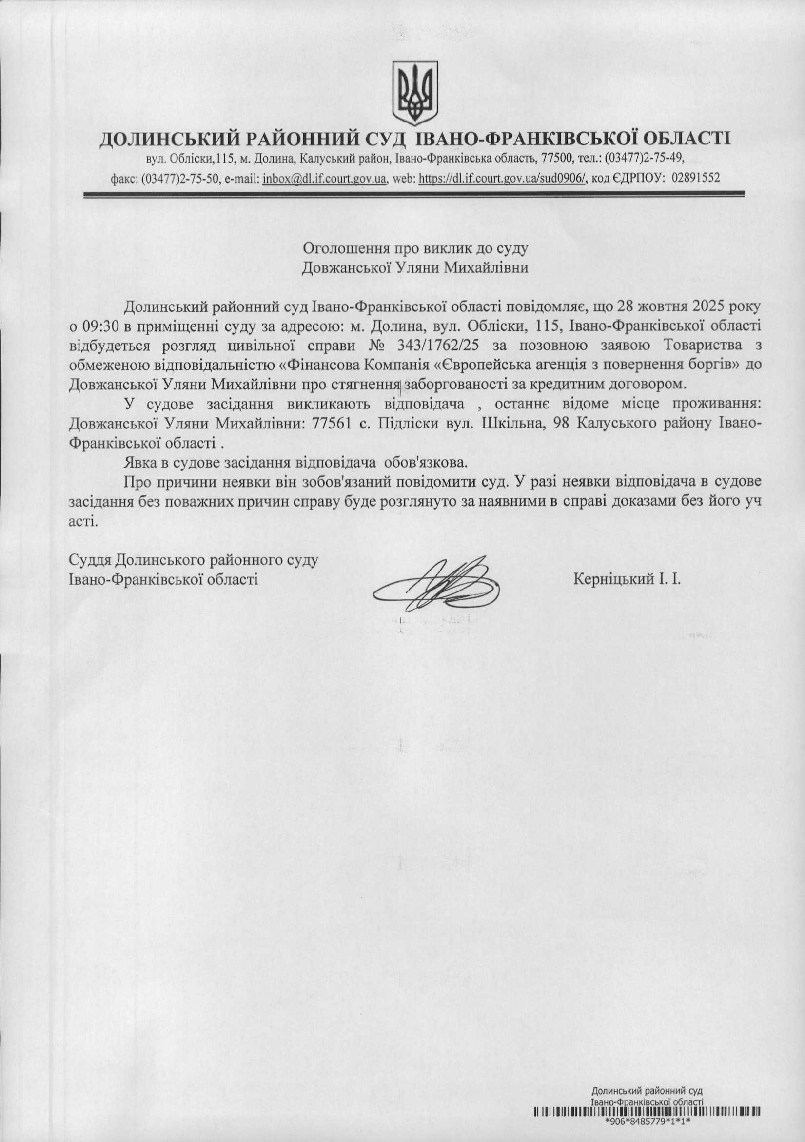 ОГОЛОШЕННЯ ПРО ВИКЛИК до СУДУ Довжанської Уляни Михайлівни у цивільній справі № 343/1762/25