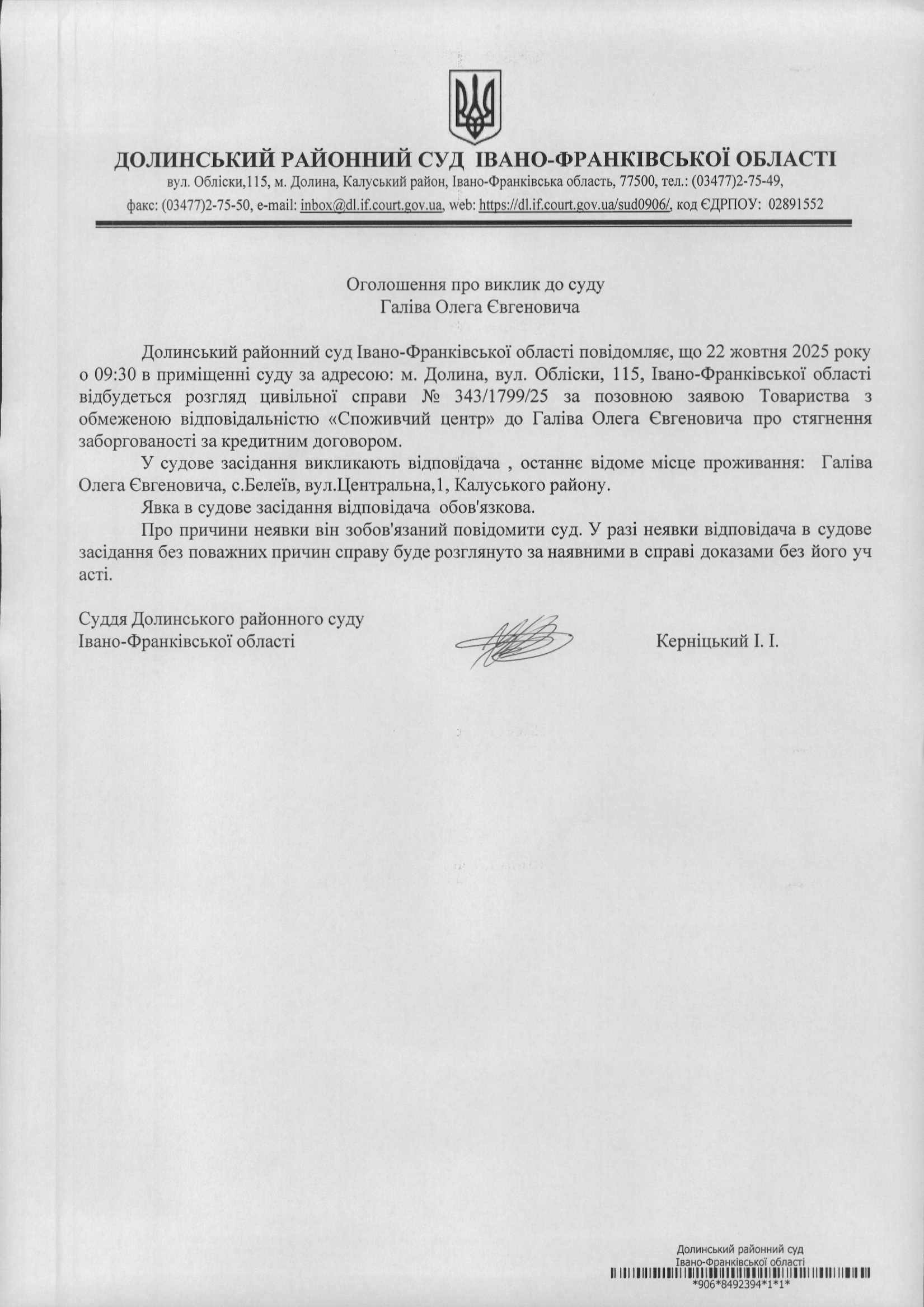 ОГОЛОШЕННЯ ПРО ВИКЛИК до СУДУ Галіва Олега Євгеновича у цивільній справі № 343/1799/25