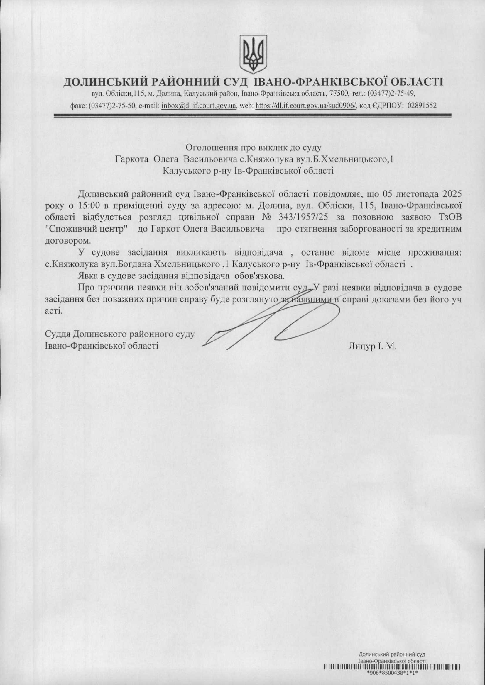 ОГОЛОШЕННЯ ПРО ВИКЛИК до СУДУ Гаркота Олега Васильовича у цивільній справі № 343/1957/25