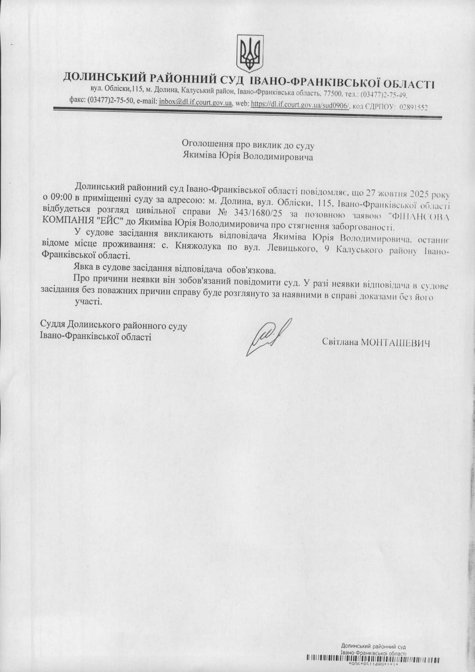 ОГОЛОШЕННЯ ПРО ВИКЛИК до СУДУ Якиміва Юрія Володимировича у цивільній справі № 343/1680/25