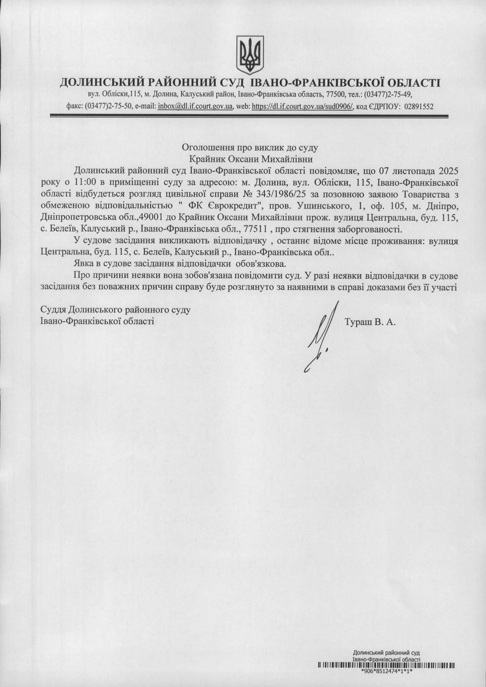 ОГОЛОШЕННЯ ПРО ВИКЛИК до СУДУ Крайник Оксани Михайлівни у цивільній справі № 343/1986/25