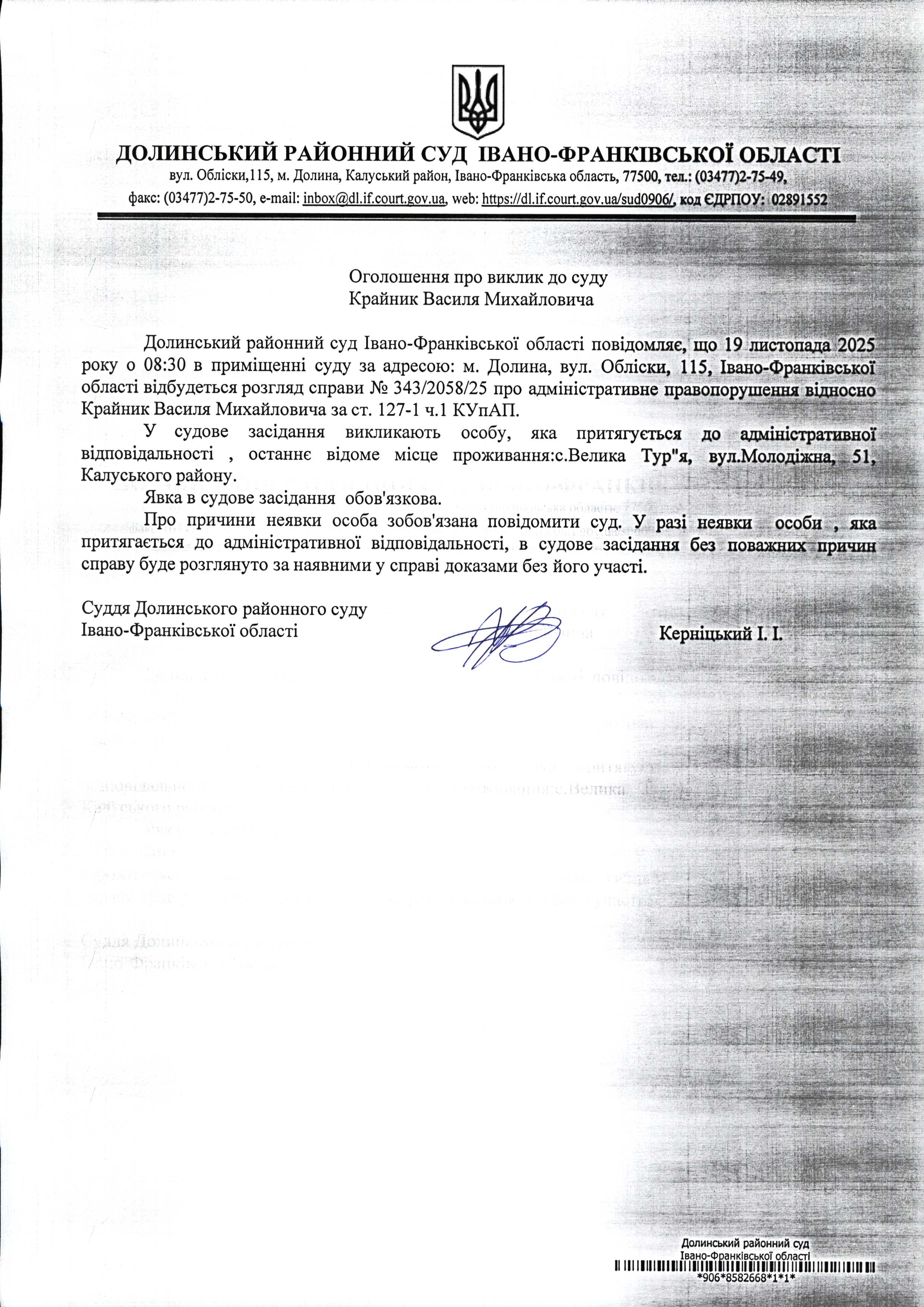 ОГОЛОШЕННЯ ПРО ВИКЛИК до СУДУ Крайника Василя Михайловича в адміністративній справі № 343/2058/25