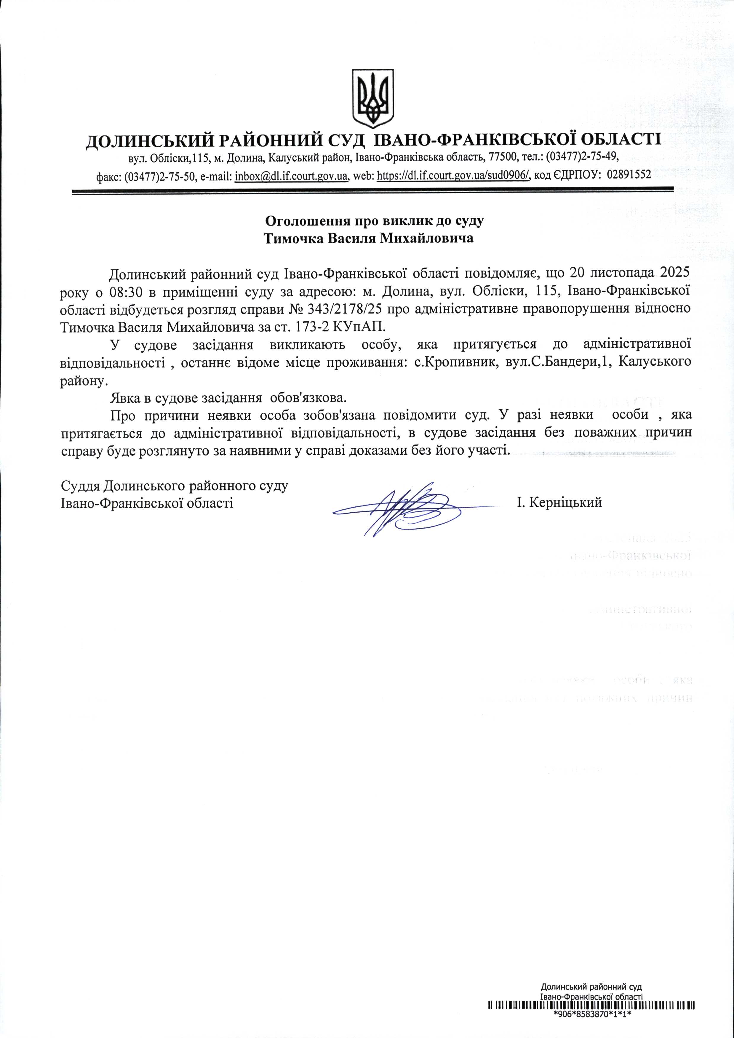 ОГОЛОШЕННЯ ПРО ВИКЛИК до СУДУ Тимочка Василя Михайловича в адміністративній справі № 343/2178/25