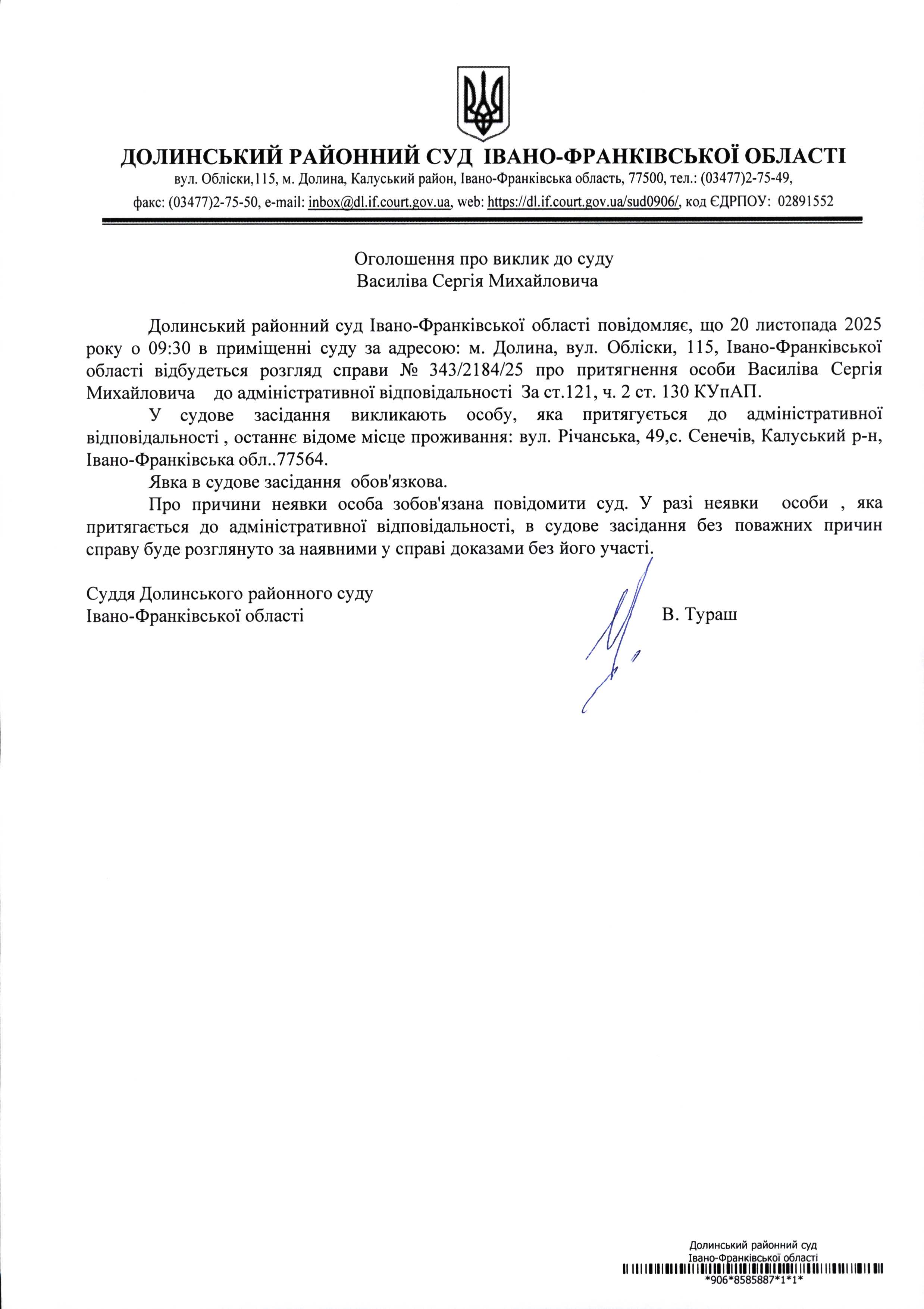 ОГОЛОШЕННЯ ПРО ВИКЛИК до СУДУ Василіва Сергія Михайловича в адміністративній справі № 343/2184/25