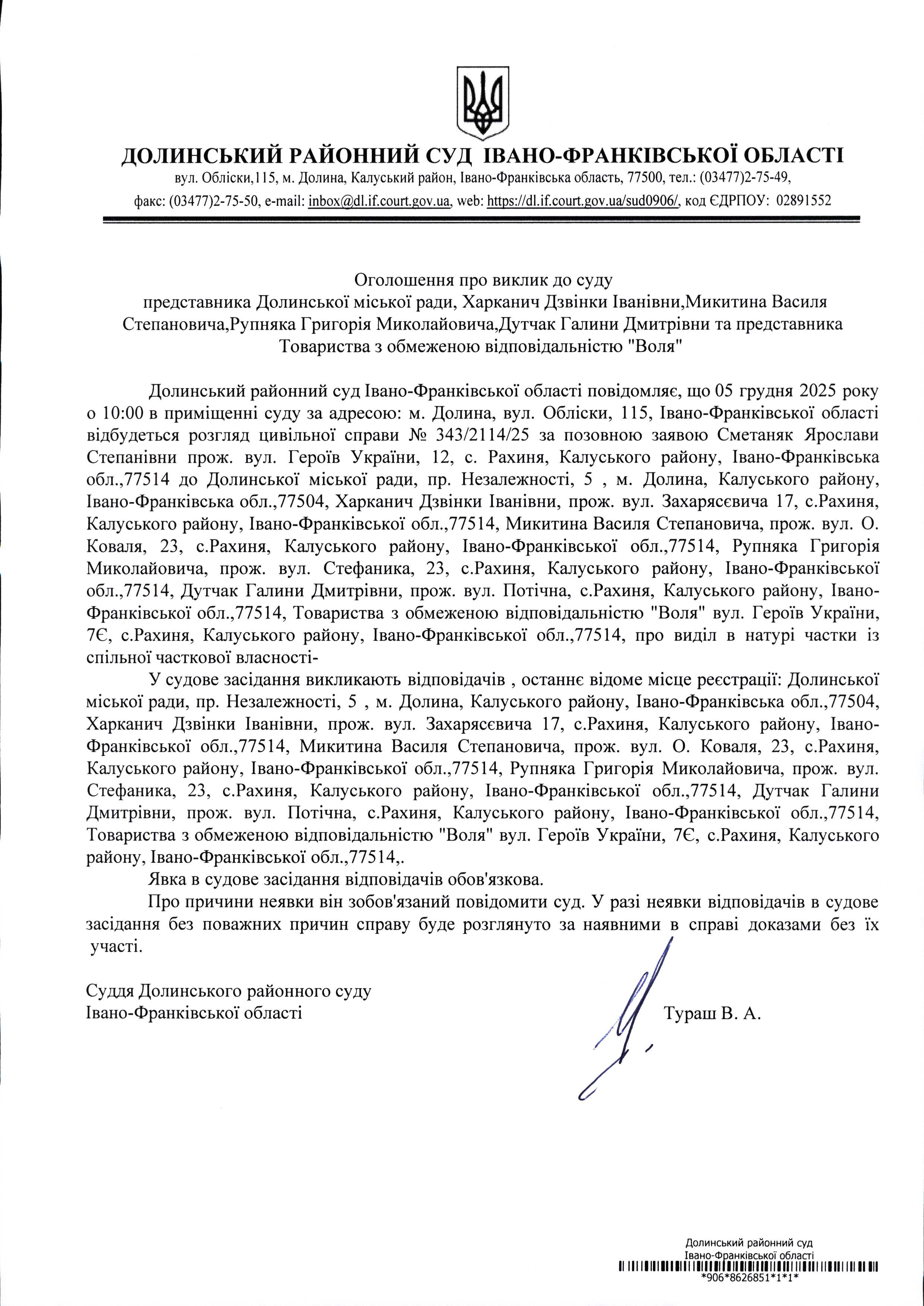 представника Долинської міської ради, Харканич Дзвінки Іванівни,Микитина Василя Степановича,Рупняка Григорія Миколайовича,Дутчак Галини Дмитрівни та представника Товариства з обмеженою відповідальністю "Воля"