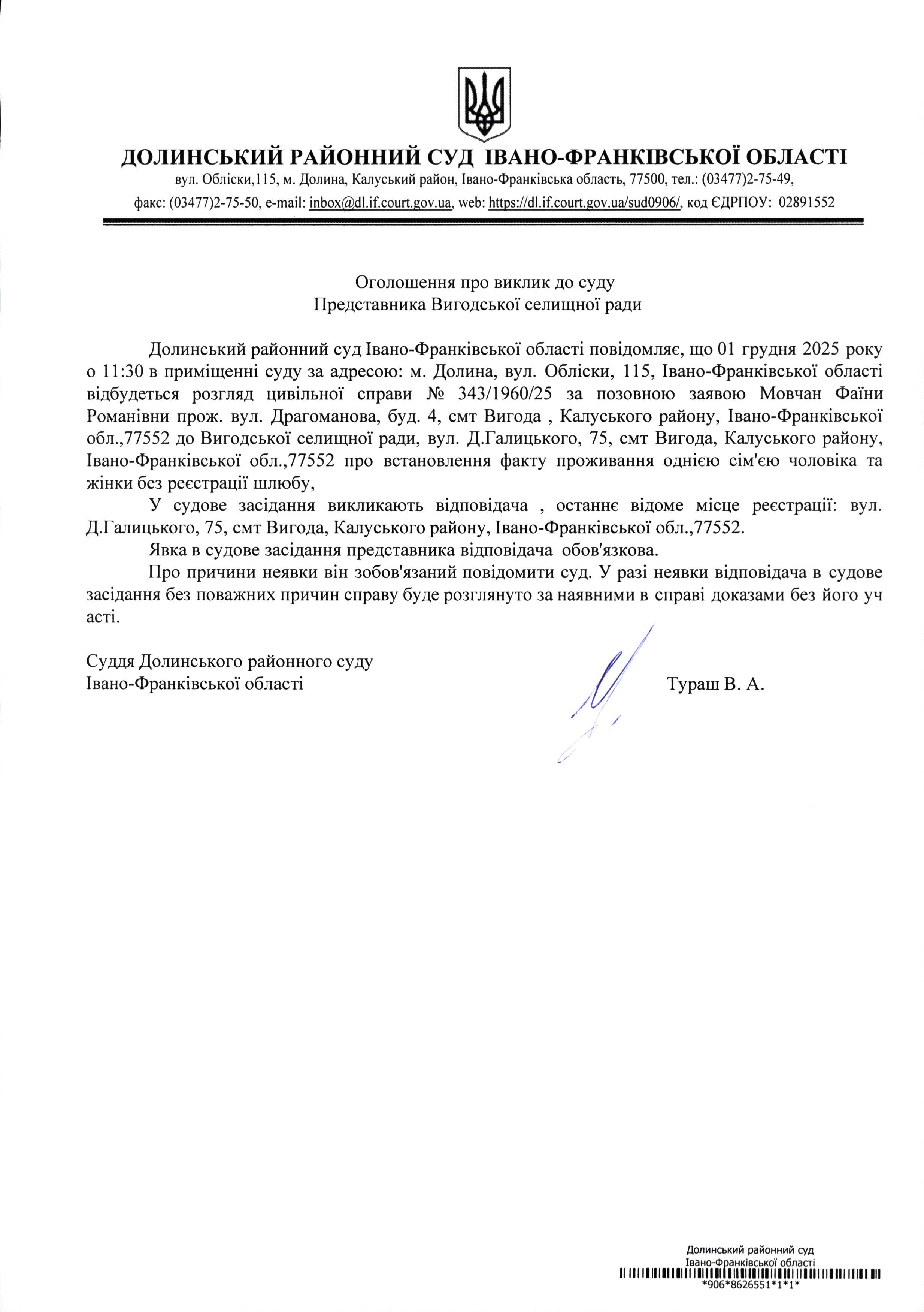 ОГОЛОШЕННЯ ПРО ВИКЛИК до СУДУ представника Вигодської селещної ради у цивільній справі № 343/1960/25