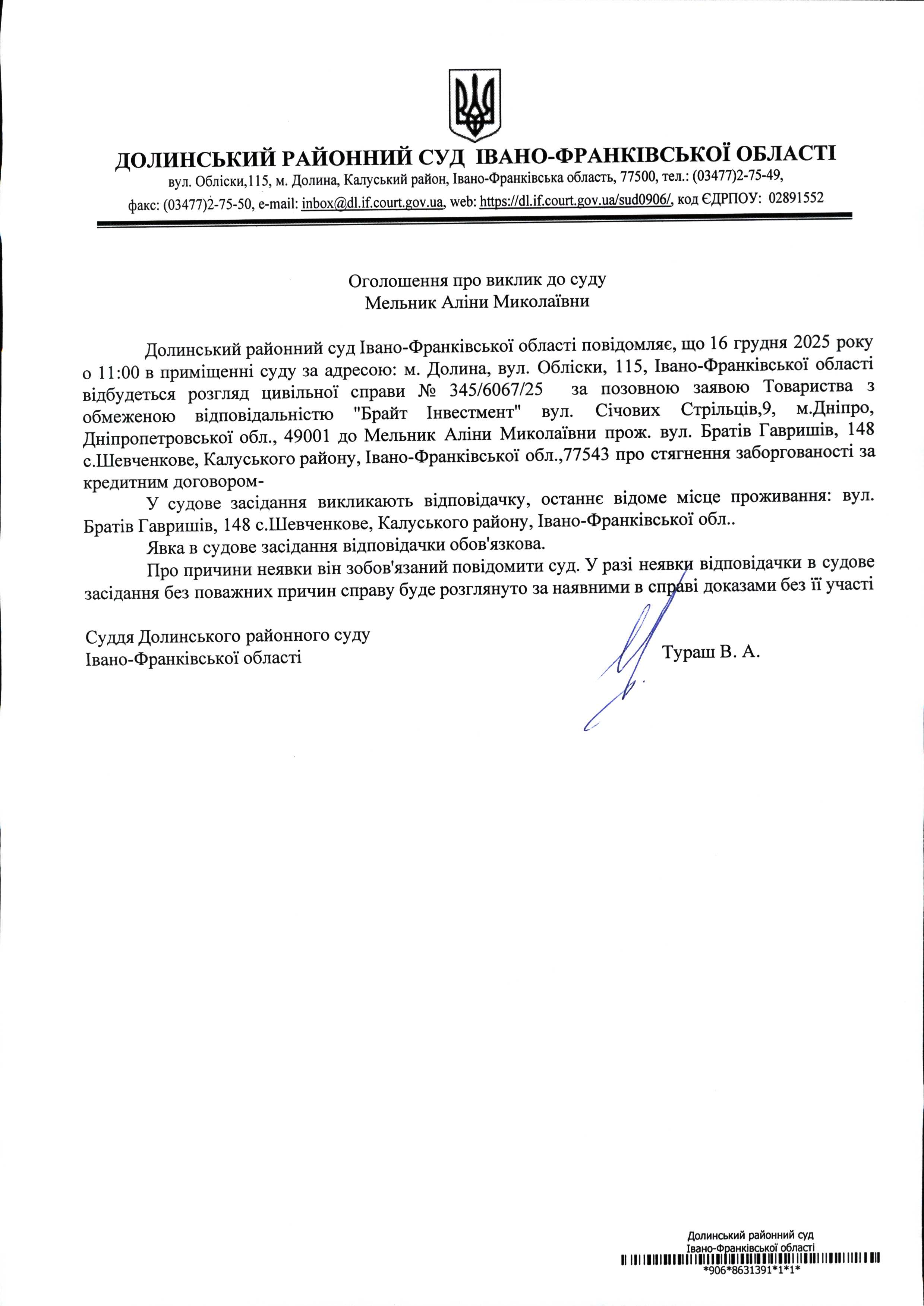 ОГОЛОШЕННЯ ПРО ВИКЛИК до СУДУ Мельник Аліни Миколаївни у цивільній справі № 345/6067/25