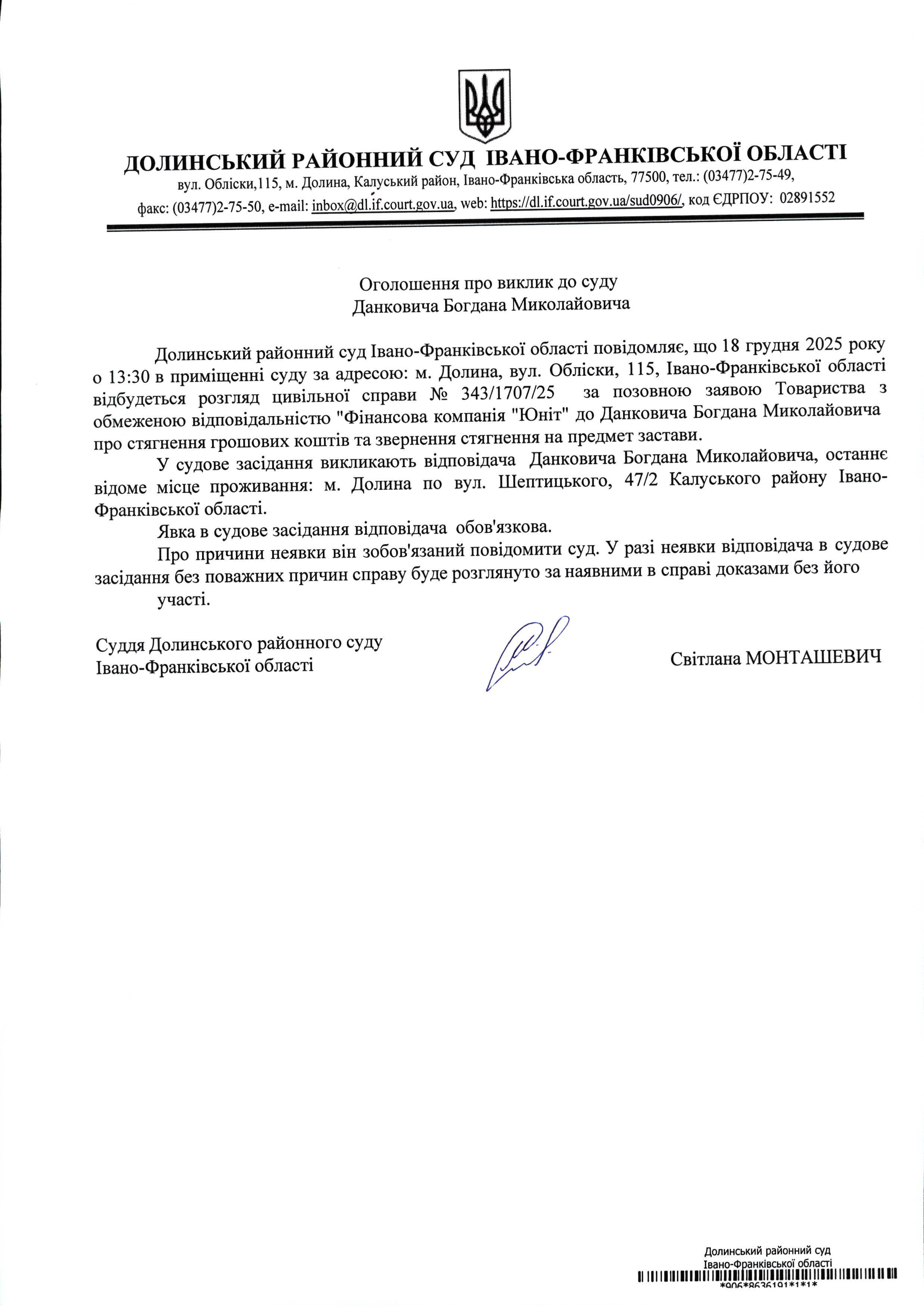 ОГОЛОШЕННЯ ПРО ВИКЛИК до СУДУ Данковича Богдана Миколайовича у цивільній справі № 343/1707/25