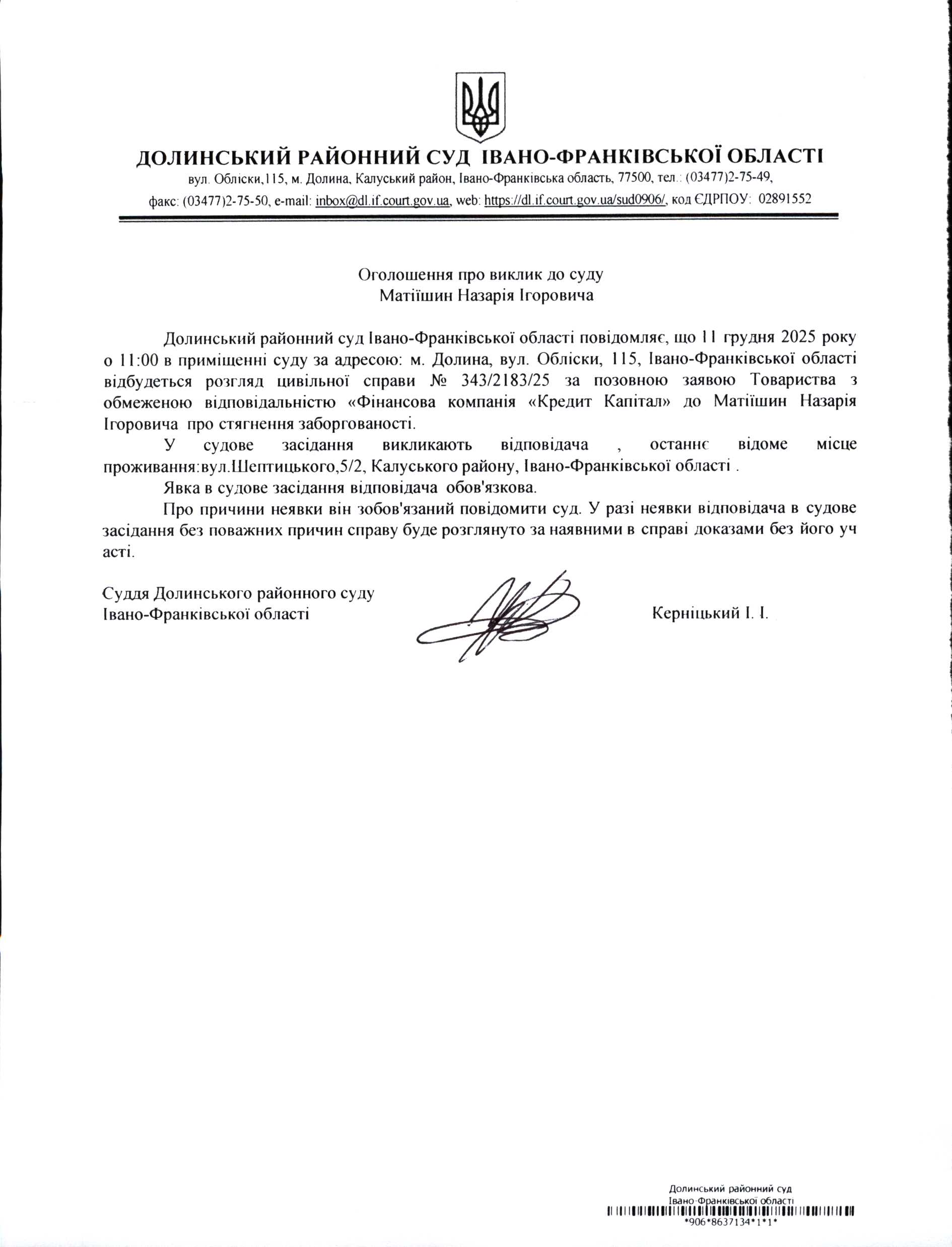 ОГОЛОШЕННЯ ПРО ВИКЛИК до СУДУ Матіїшин Назарія Ігоровича у цивільній справі № 343/2183/25