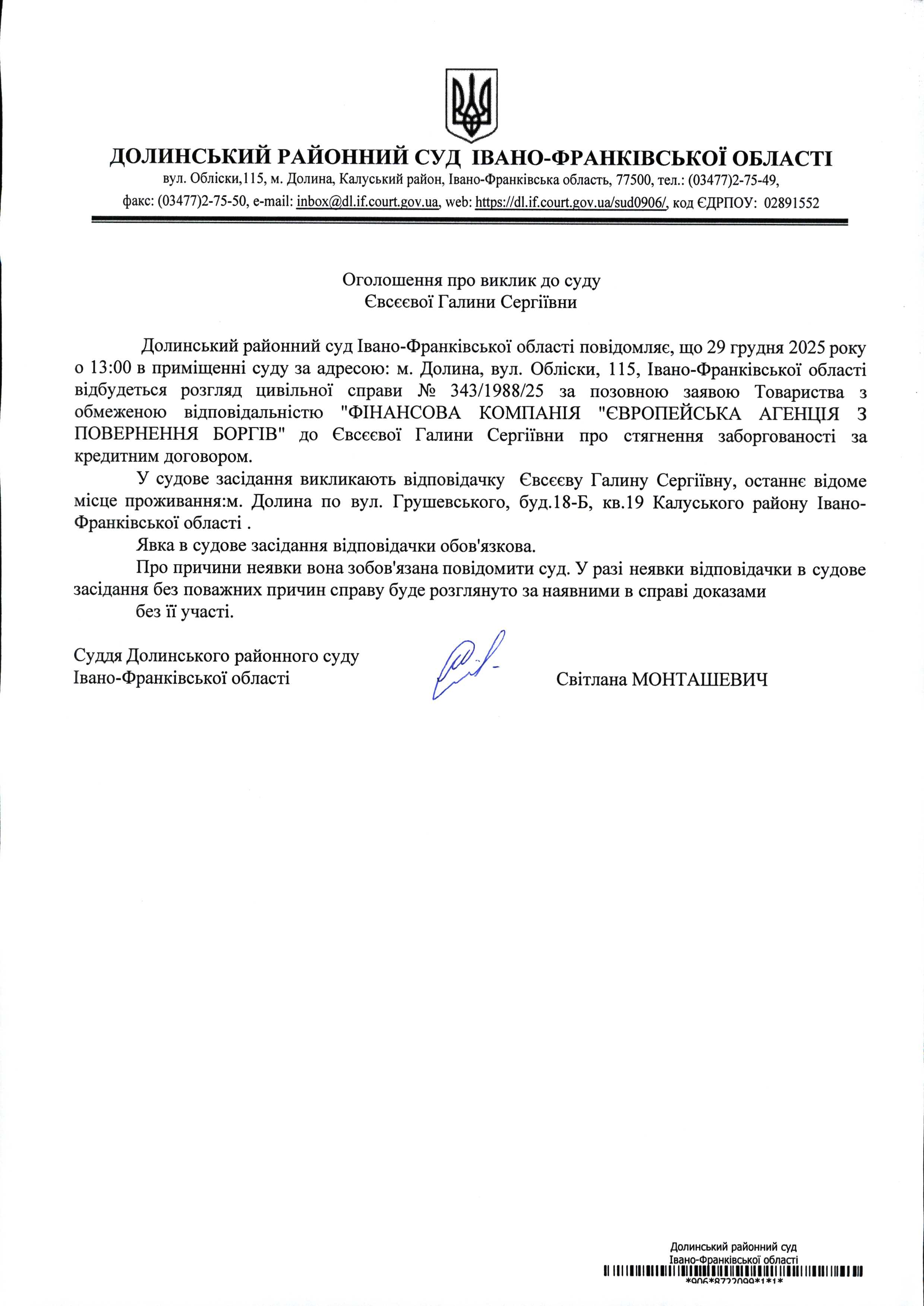 ОГОЛОШЕННЯ ПРО ВИКЛИК до СУДУ Євсєєвої Галини Сергіївни у цивільній справі № 343/1988/25