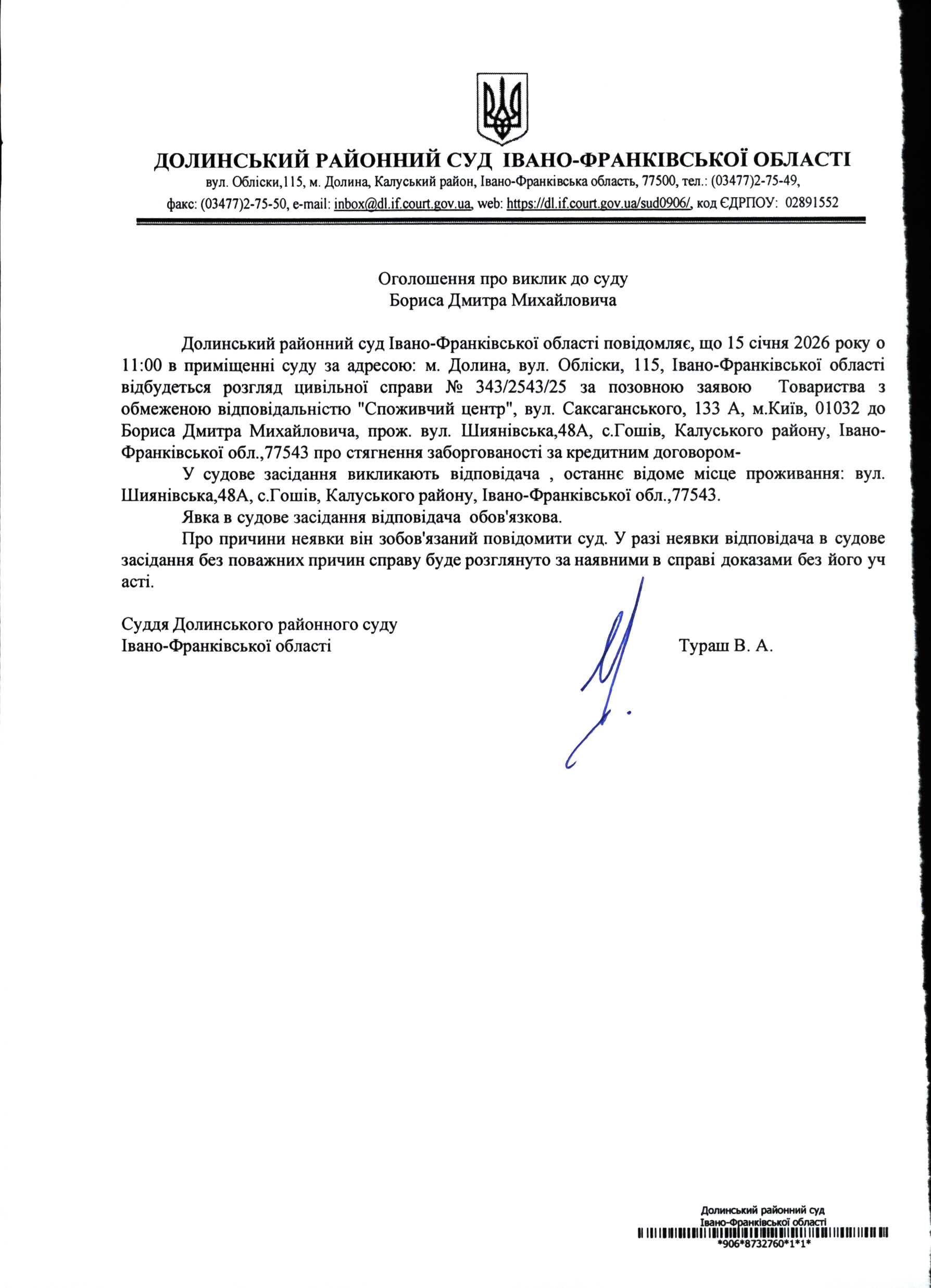 ОГОЛОШЕННЯ ПРО ВИКЛИК до СУДУ Бориса Дмитра Михайловича у цивільній справі № 343/2543/25
