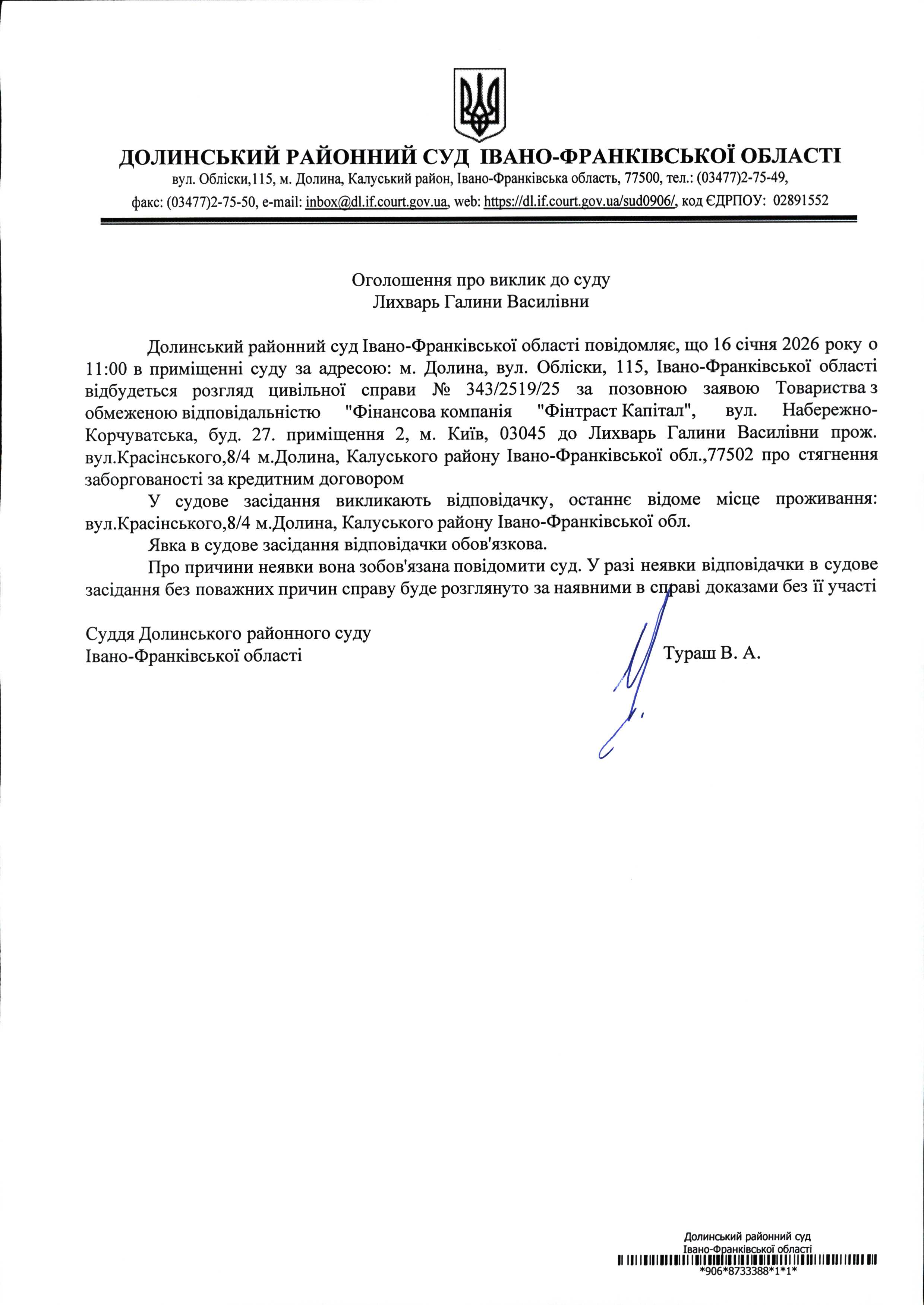 ОГОЛОШЕННЯ ПРО ВИКЛИК до СУДУ Лихварь Галини Василівни у цивільній справі № 343/2519/25