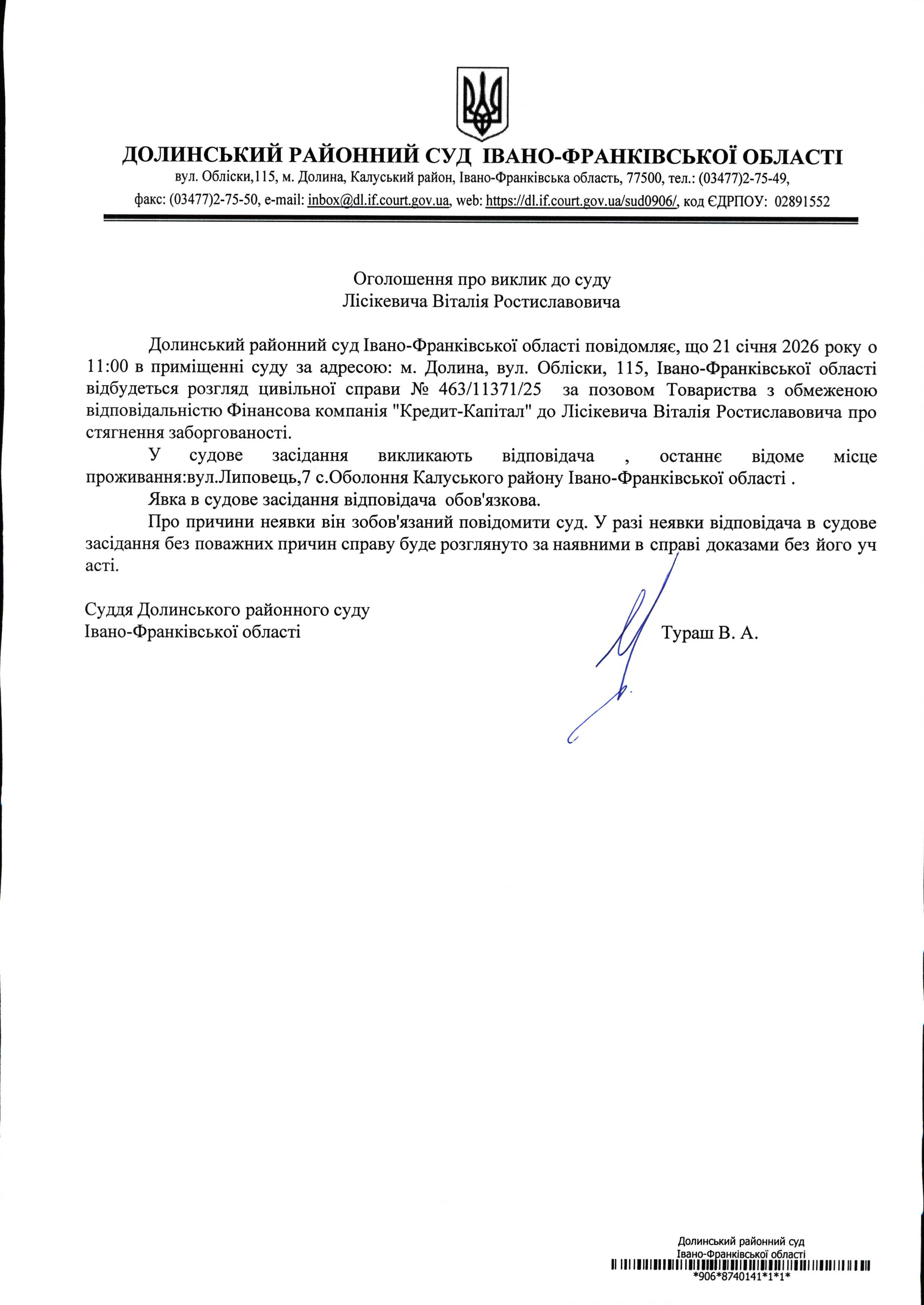 ОГОЛОШЕННЯ ПРО ВИКЛИК до СУДУ Лісікевича Віталія Ростиславовича у цивільній справі № 463/11371/25