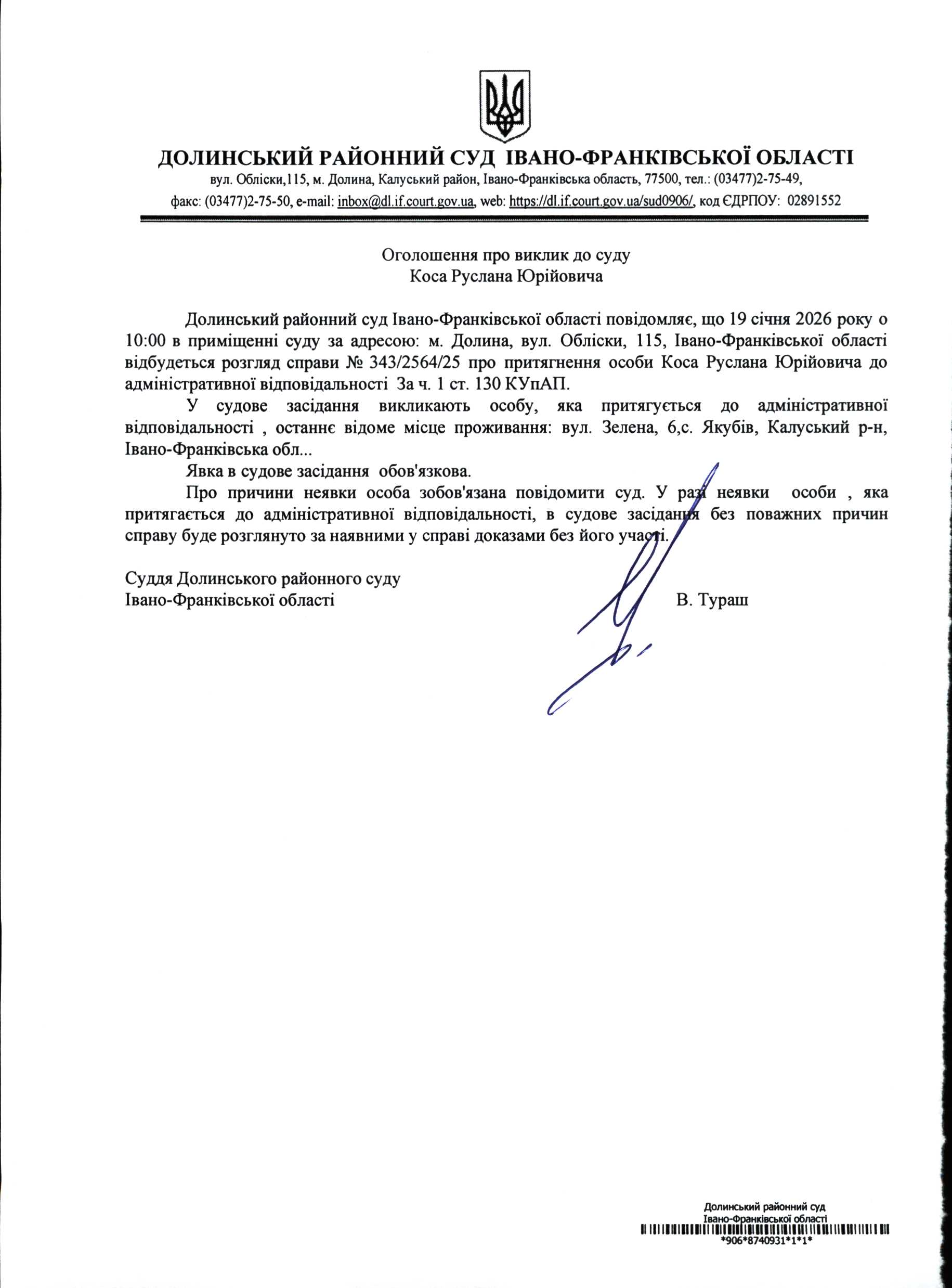 ОГОЛОШЕННЯ ПРО ВИКЛИК до СУДУ Коса Руслана Юрійовича у справі про адміністративне правопорушення № 343/2564/25