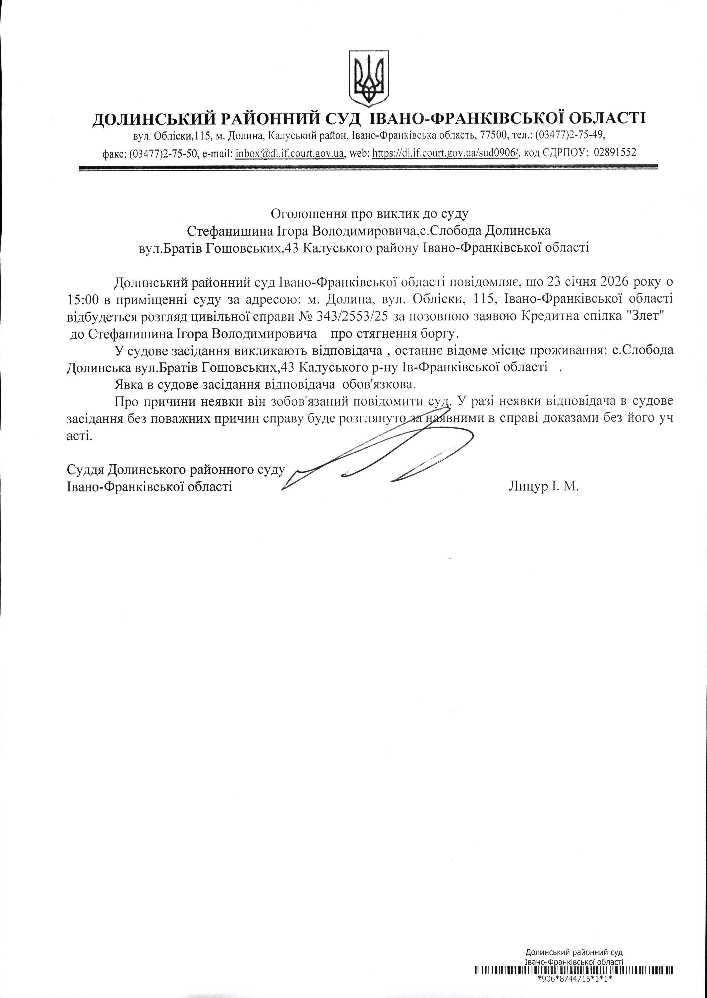 ОГОЛОШЕННЯ ПРО ВИКЛИК до СУДУ Стефанишина Ігора Володимировича у цивільній справі № 343/2553/25