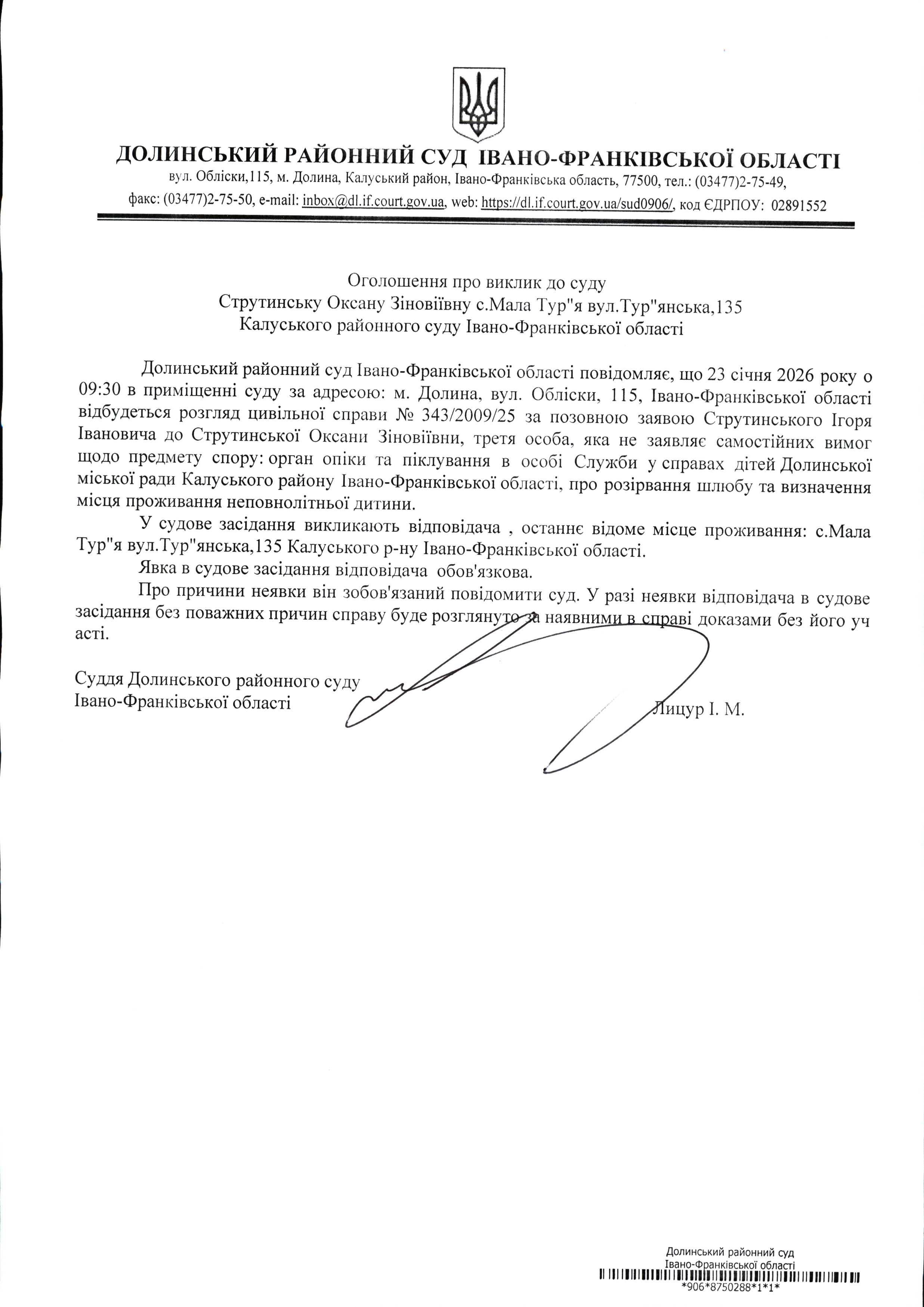 ОГОЛОШЕННЯ ПРО ВИКЛИК до СУДУ Струтинську Оксану Зіновіївну у цивільній справі № 343/2009/25