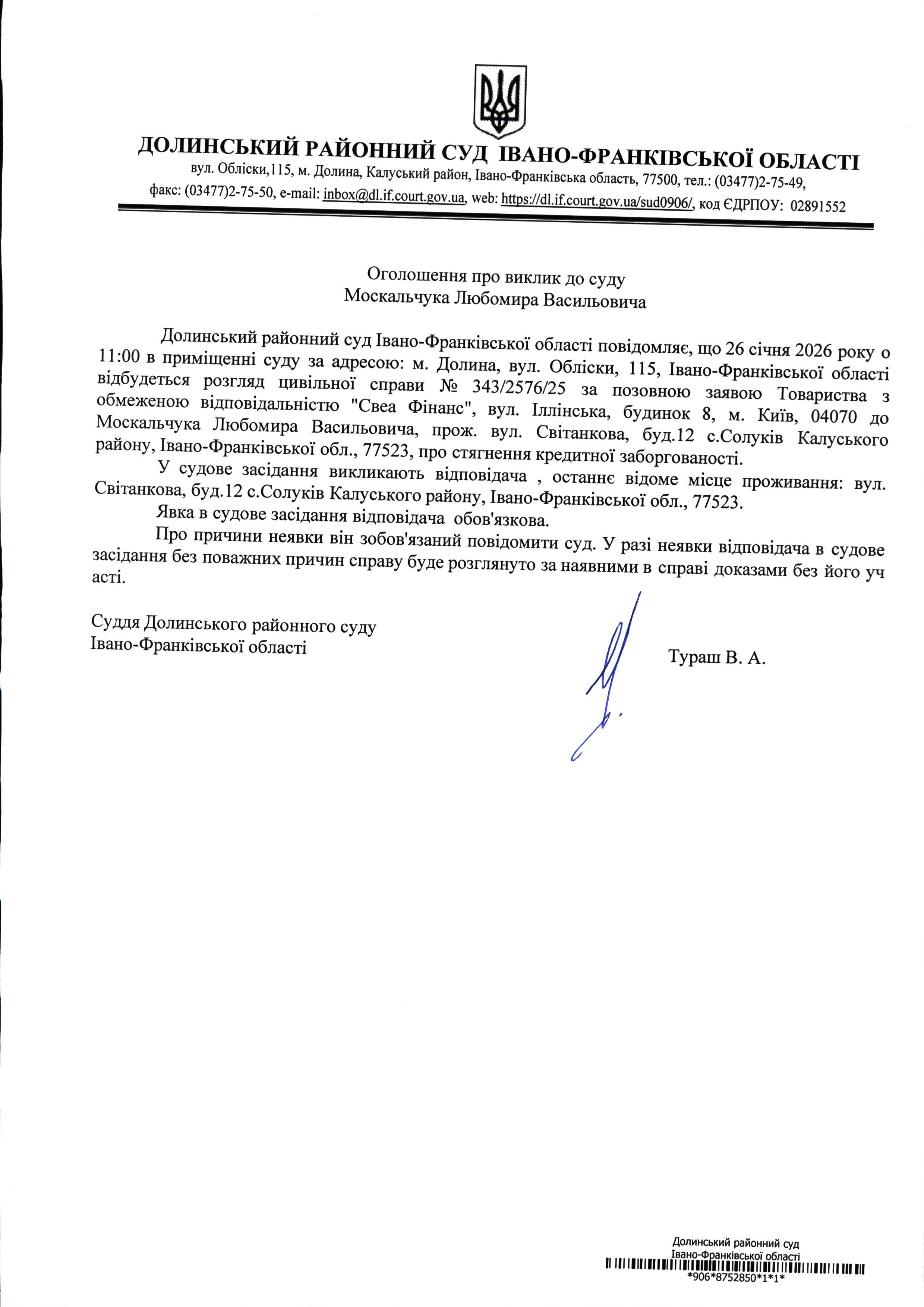 ОГОЛОШЕННЯ ПРО ВИКЛИК до СУДУ Москальчука Любомира Васильовича у цивільній справі № 343/2576/25