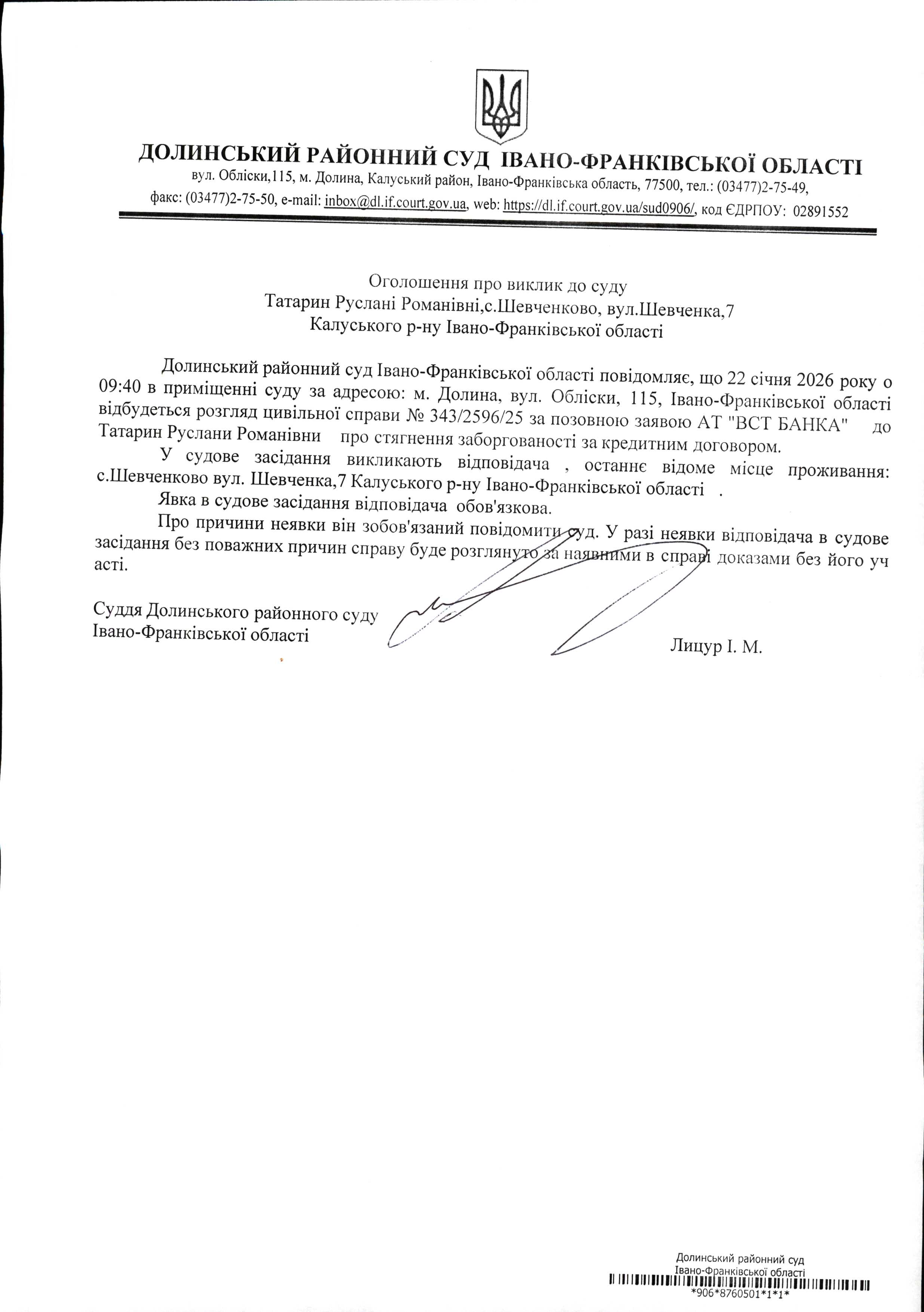 ОГОЛОШЕННЯ ПРО ВИКЛИК до СУДУ Татарин Руслані Романівні у цивільній справі № 343/2596/25