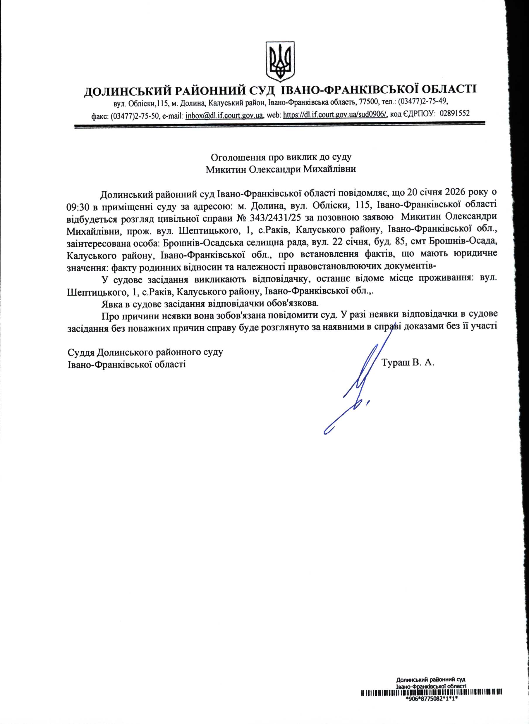 ОГОЛОШЕННЯ ПРО ВИКЛИК до СУДУ Микитин Олександри Михайлівни у цивільній справі № 343/2431/25