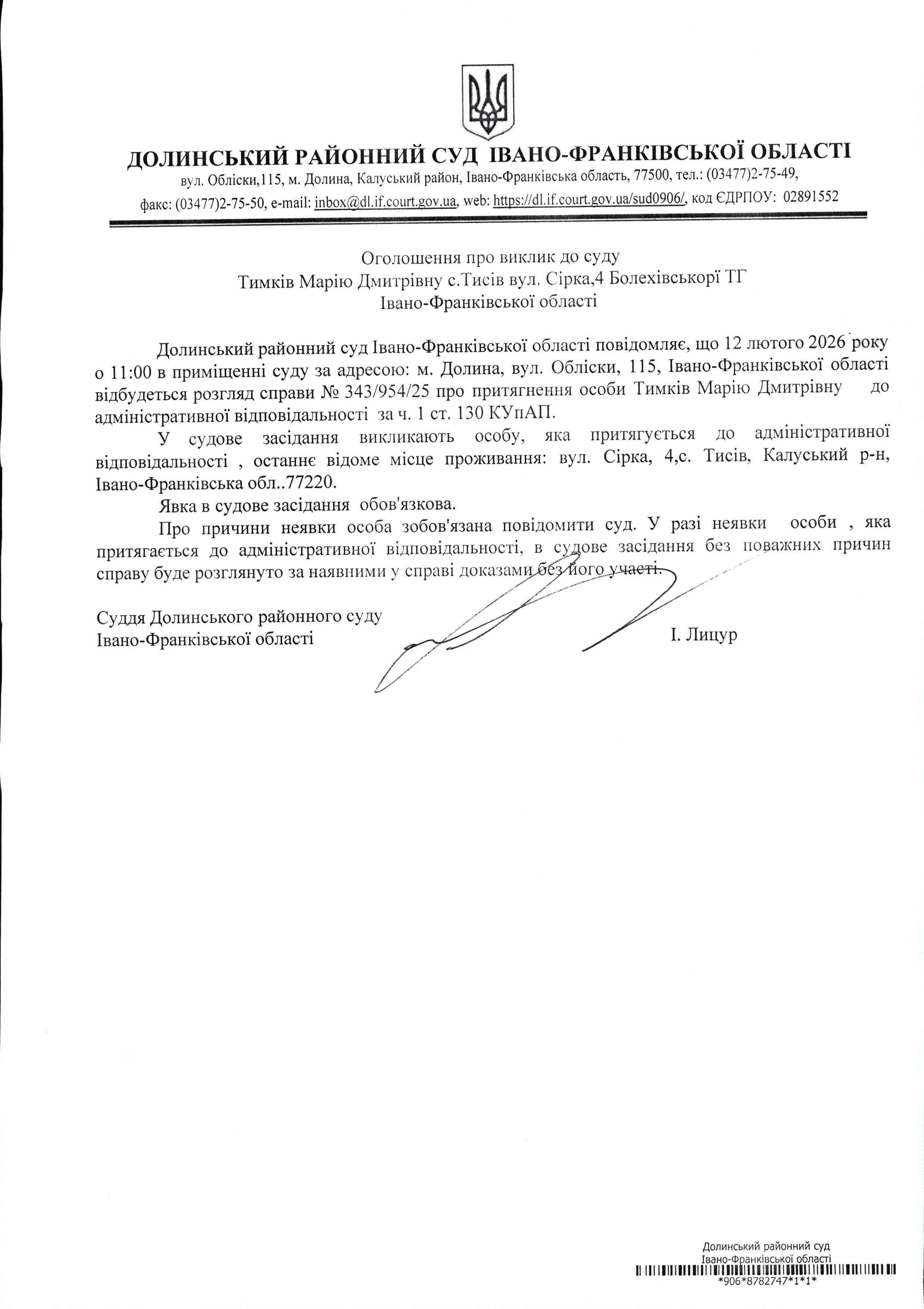 ОГОЛОШЕННЯ ПРО ВИКЛИК до СУДУ Тимків Марію Дмитрівну у цивільній справі № 343/954/25